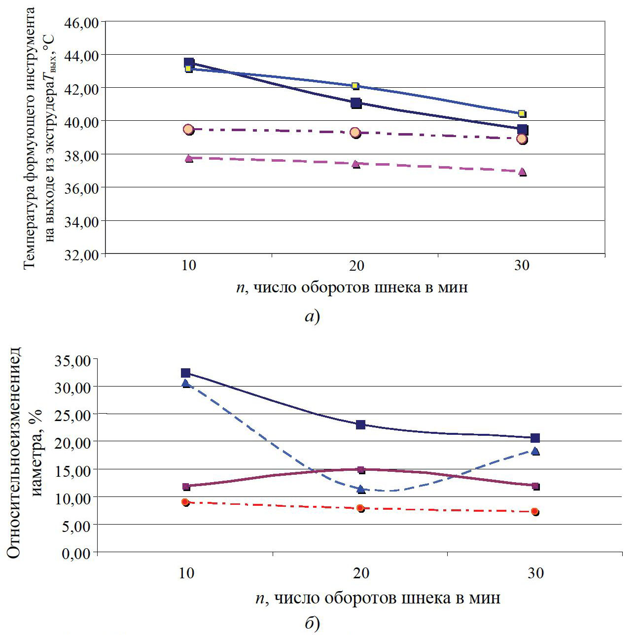 Рис. 3. Зависимости температуры формующего инструмента на выходе из формующей головки Твых (а) и относительного изменения диаметра экструдата d до и после его охлаждения (б) от частоты вращения шнека n: –■– без ультразвука при dм = 10,4 мм, l = 39 мм; -▲- – с применением ультразвука при dм = 10,4 мм, l = 39 мм; -☐- – без ультразвука при dм= 18 мм, l = 55 мм; -○- – с применением ультразвука при dм = 18 мм, l = 55 мм