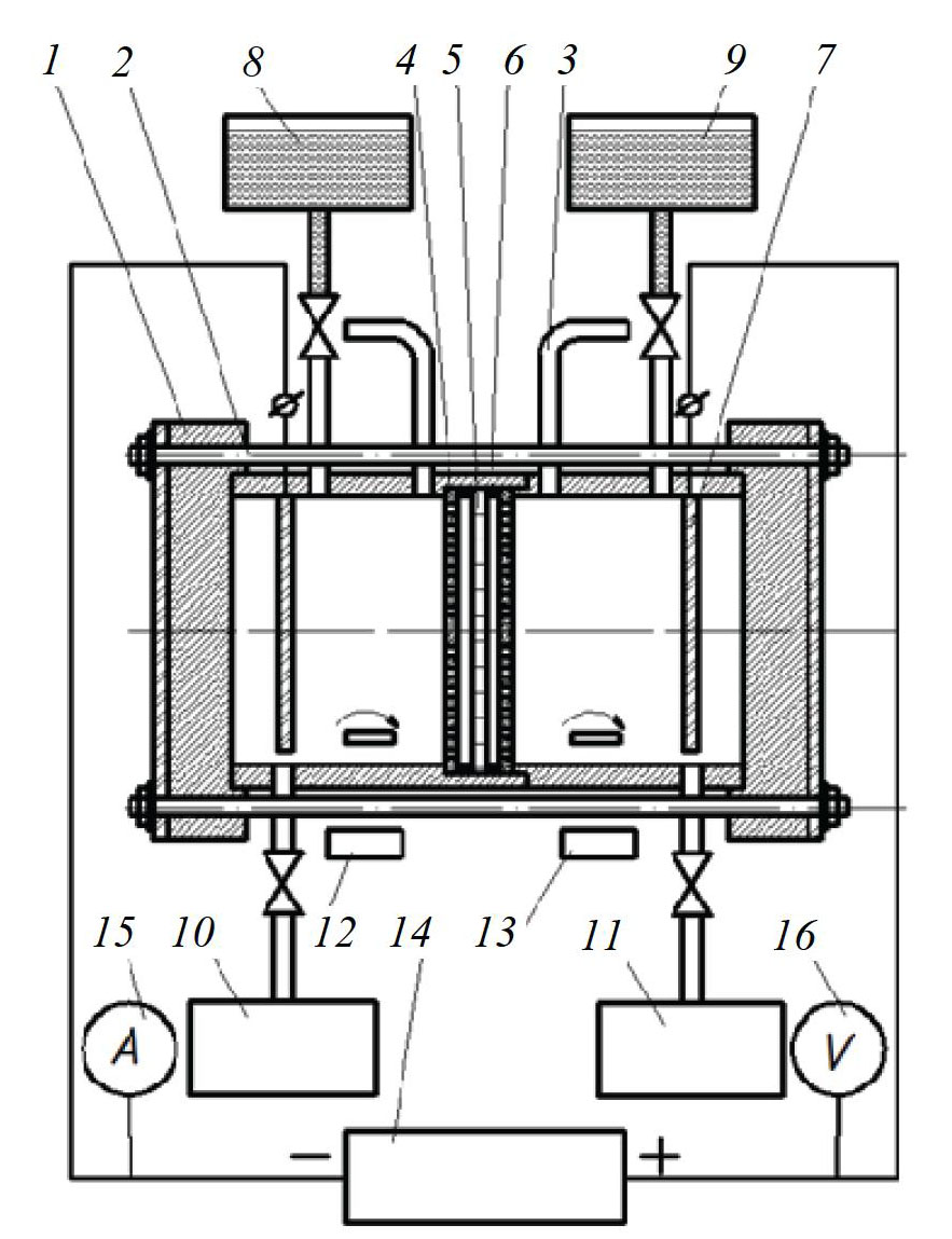1 – корпус; 2 – шпильки; 3 – капилляры; 4 – перфорированные пластины; 5 – мембрана; 6 – прокладки; 7 – электроды; 8 – 11 – емкости раствора; 12, 13 – магнитные мешалки; 14 – источник постоянного тока; 15 – амперметр; 16 – вольтметр