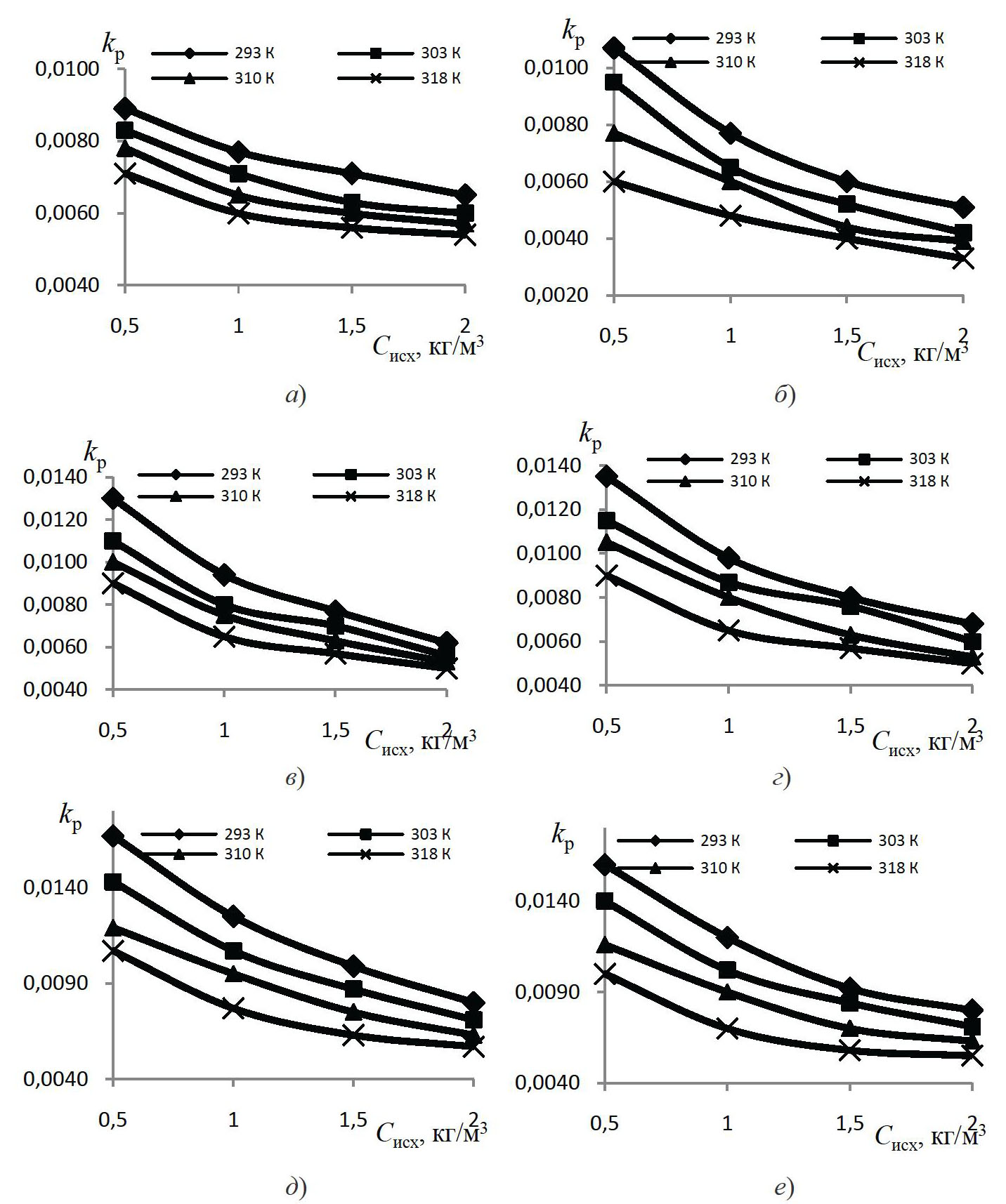 где С – концентрация раствора, кг/м³; T0, T – реперная (293 K) и рабочая температуры соответственно; b, n, m – экспериментальные коэффициенты.