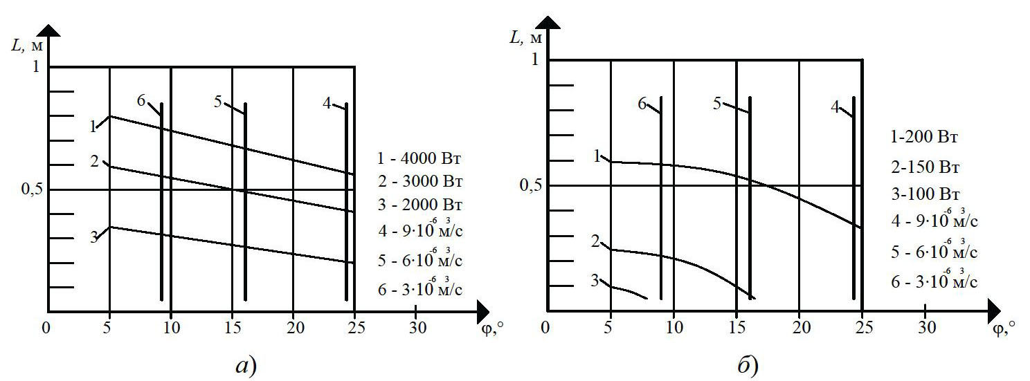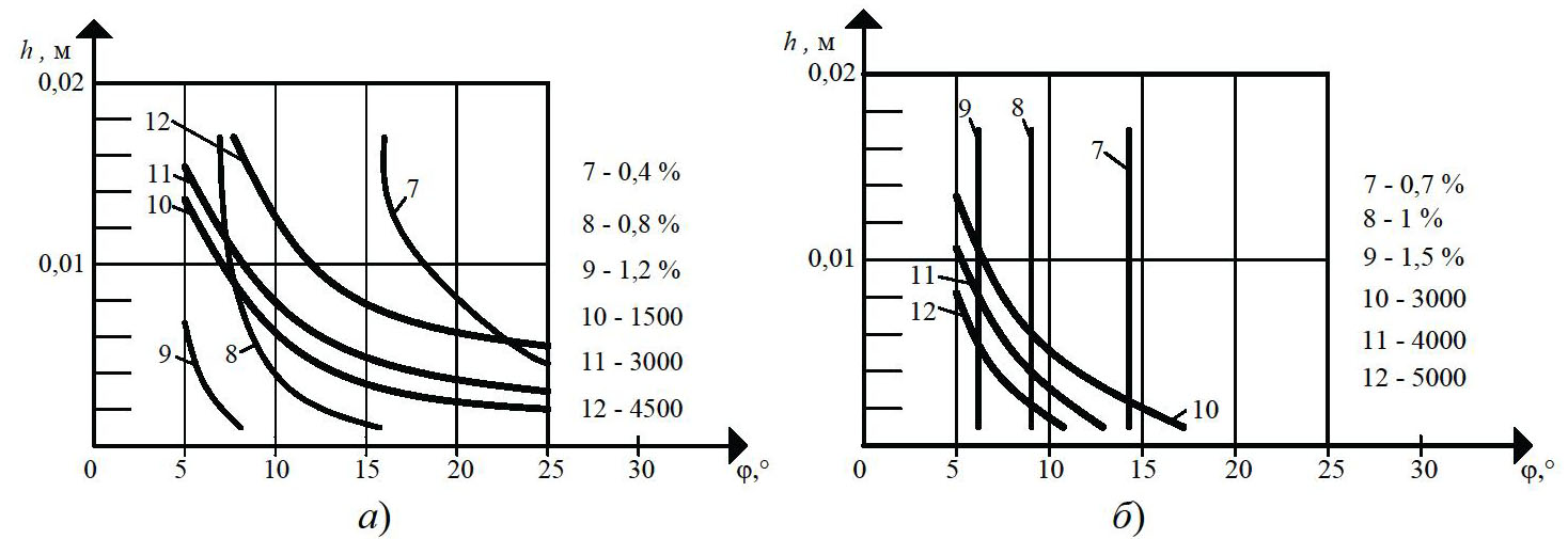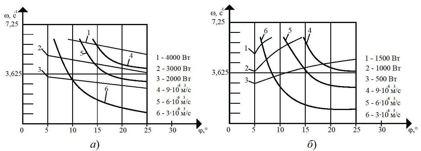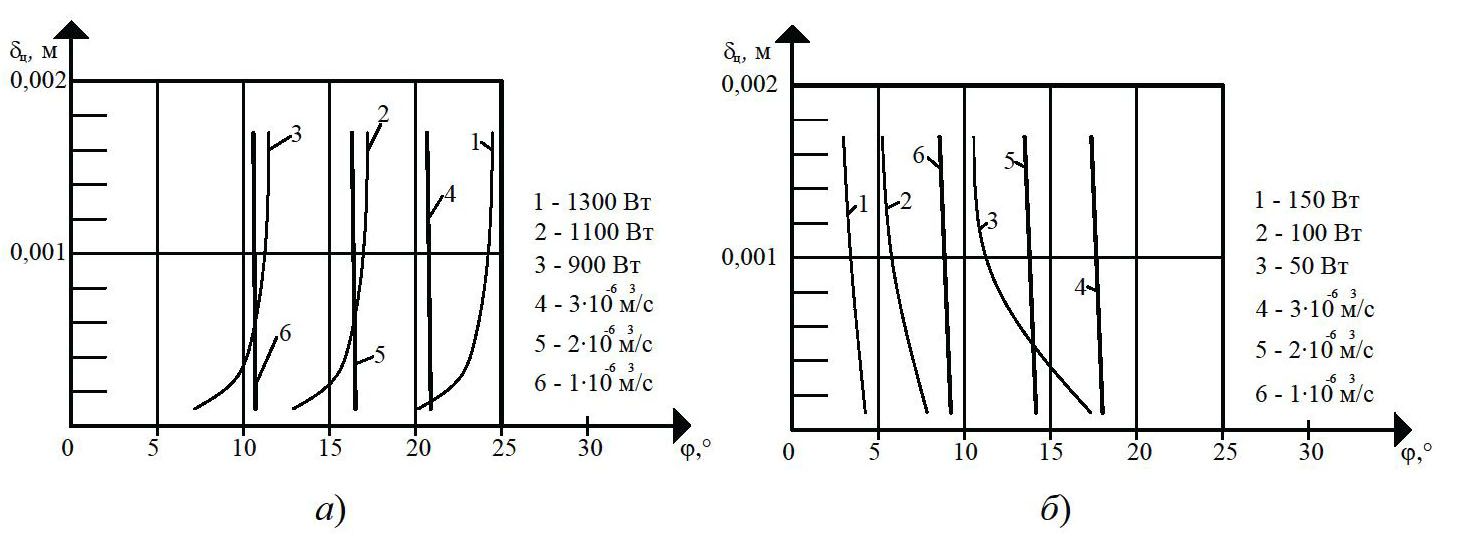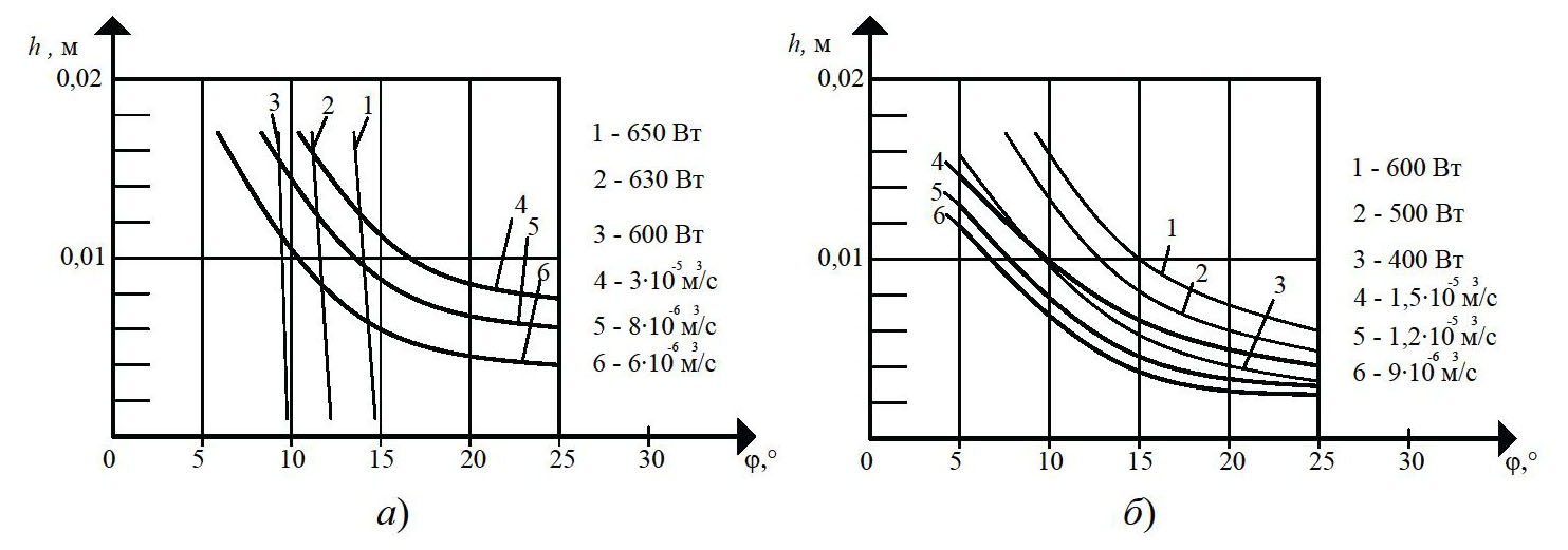На рисунке 1 показано влияние угла наклона винтовой линии j и глубины винтового канала червяка h на полезную мощность N, производительность Q. Очевидно, что изменение угла наклона нарезки j на 33 % в области своих реальных значений (15…20°) увеличивает полезную мощность N на 20 % (см. рис. 1, а). Увеличение глубины винтового канала червяка h (0,004…0,006 м) на 50 % приводит к увеличению полезной мощности N на 25 % (кривые 1 – 3), так как с увеличением глубины винтового канала h захватывается больше перерабатываемого материала, и, следовательно, требуется большее усилие на транспортирование резиновой смеси вдоль канала червяка. Как видно из рис. 1, б, угол наклона нарезки j в области своих реальных значений (15…20°) и глубина винтового канала h (0,004…0,008 м) незначительно влияют на изменение полезной мощности N (2 – 8 %), так как с изменением угла наклона нарезки j гидравлическое сопротивление материала в винтовом канале практически не изменяется.