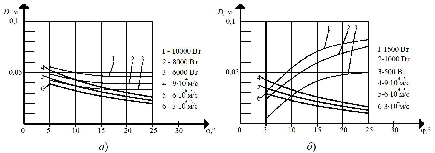 На рисунке 3 показано влияние угла наклона винтовой линии j и наружного диаметра D червяка на полезную мощность N, производительность Q. Угол наклона винтовой линии червяка j в области своих реальных значений, по сравнению с наружным диаметром червяка D, влияет незначительно на изменение полезной мощности N. Причем, увеличение наружного диаметра червяка D на 33 % приводит к увеличению полезной мощности N на 60 % (кривые 1 – 3), так как увеличивается гидравлическое сопротивление материала в винтовом канале червяка и, следовательно, увеличиваются силы трения между резиновой смесью и материалом цилиндра, а также интенсивность сдвиговой деформации перерабатываемого материала, что приводит к увеличению мощности, расходуемой на транспортирование резиновой смеси вдоль канала, и мощности диссипации. Увеличение угла наклона нарезки j на 33 % приводит к увеличению полезной мощности N при изотермическом и неизотермическом режимах соответственно на 20 % (см. рис. 3, а) и 5 % (см. рис. 3, б).