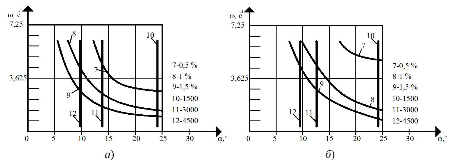 Рис. 12. Линии уровня функций критерия подвулканизации JB (7 – 9) исуммарного сдвига γш (10 – 12) для H = 0,004 м; D = 0,032 м; w = 3,14 c⁻¹ (30 об/мин); L = 0,32 м; dц= 0,001 м: а – изотермический режим; б – неизотермический режим экструзии