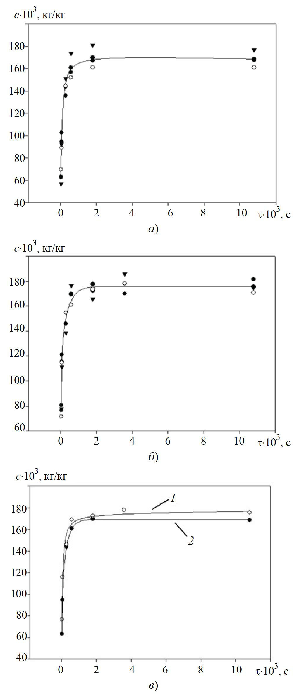 Рис. 1. Кинетика сорбции гидроксида натрия: а – легкой хлопчатобумажной тканью; б – хлопчатобумажной тканью средней плотности; в – легкой тканью 1 и тканью средней плотности 2