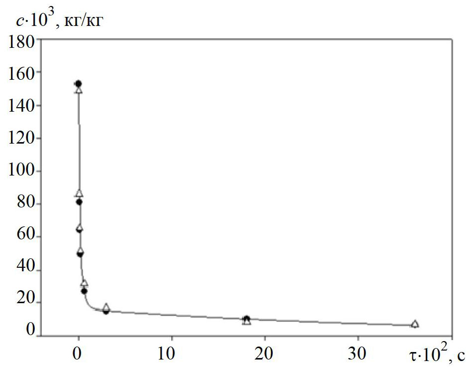 Рис. 2. Кинетика промывки (десорбции) гидроксида натрия из легкой ткани (●) и ткани средней плотности (Δ)
