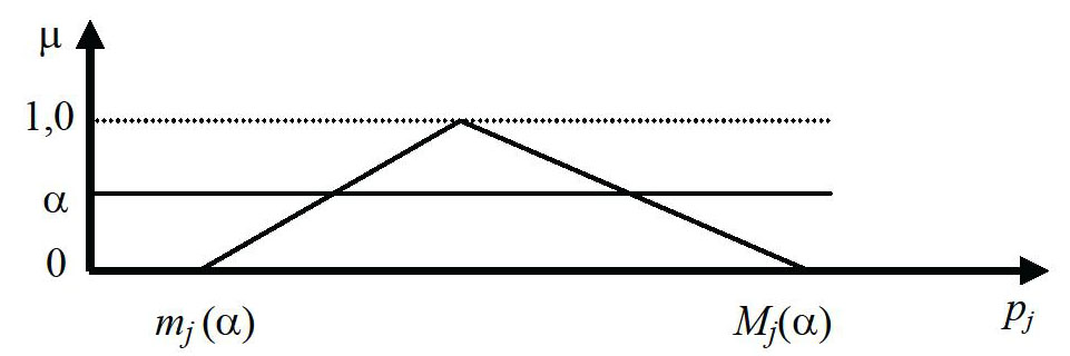 Представим в форме треугольных функций принадлежности m(pj) и m(wj) (рис. 1, 2). Если функции принадлежности нечеткой вероятности и нечеткой важности выпуклые и непрерывные, то a-сечение есть замкнутый интервал. Функцию принадлежности каждого показателя будем строить для тех же a, и a-сечения важности каждого показателя есть замкнутый интервал с границами [9, 10]: