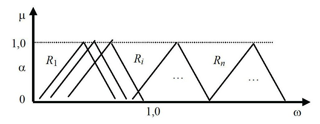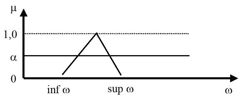 Так как функции принадлежности нечетких вероятностей и нечетких важностей значений показателей алгоритмов формализации в условиях неопределенности элементов моделей объектов распознавания известны, то задаваясь различными значениями a, получаем тот материал, обработав который и найдем функции принадлежности важности показателей алгоритмов формализации в условиях неопределенности элементов моделей (рис. 4).