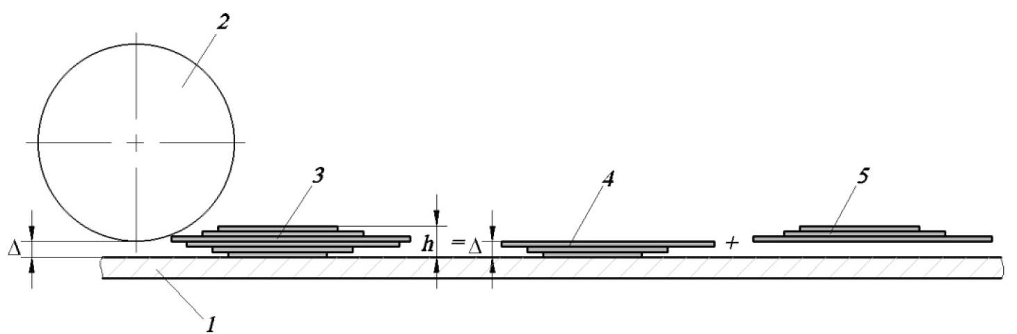 Ранее предложен механизм процесса расслоения одной частицы на две [15], в котором предполагалась равная вероятность расслоения одной частицы графита, содержащей N слоев, на две с числом графеновых слоев от 1 до N – 1. Результаты экспериментальных исследований показали, что под стержнями всегда находятся частицы, которые образуют зазор Δ между стержнями и внутренней поверхностью вращающегося барабана. Данный факт вносит существенные изменения в механизм процесса расслоения [15], поскольку часть частиц, толщина которых меньше величины зазора Δ, в процессе эксфолиации не участвует. Таким образом, в результате эксфолиации из частицы с толщиной h образуются две частицы с толщинами Δ и h – Δ. Установлено также, что в процессе эксфолиации величина указанного зазора уменьшается, по всей видимости, в результате снижения средней толщины частиц. Для моделирования процесса в работе [15] использовался математический аппарат случайных марковских процессов, дискретных в пространстве и времени. Учитывая, что число графеновых слоев в частицах графита составляет несколько тысяч, размерность вектора состояния системы, а, следовательно, и размерность матрицы переходных вероятностей были огромны, что затрудняло расчеты по данной модели. Результаты экспериментальных исследований показали, что окончательная эксфолиация в роторных аппаратах с подвижными лопастями наиболее интенсивно реализуется, когда толщина частиц в исходной суспензии менее 100 нм. Исходя из этого предлагается новый механизм эксфолиации графита в стержневой мельнице при следующих допущениях: гранулометрический состав исходного материала, поступающего в стержневую мельницу, состоит из фракций, каждая из которых содержит частицы с толщиной, кратной 100 нм; зазор Δ между стержнями и внутренней поверхностью барабана зависит от гранулометрического состава суспензии в текущий момент; в результате расслоения одной частицы с толщиной hi образуются две частицы с толщинами Δ и hi – Δ. Схема механизма эксфолиации показана на рис. 1.