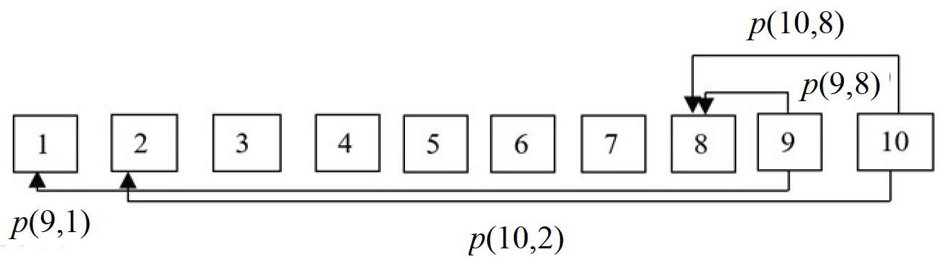 Обычно систему представляют в виде цепи Маркова, которая состоит из ячеек. Для рассматриваемого примера цепь Маркова показана на рис. 2. Частицы со средней толщиной находятся в девяти ячейках. Предположим, что зазор между стержнем и обечайкой барабана равен средней толщине частиц, находящихся в ячейке 8. Частицы, которые находятся в ячейках с первой по восьмую, не будут участвовать в процессе эксфолиации, поэтому для них элементы матрицы переходных вероятностей р(i, i) = 1, а остальные элементы равны нулю. Из каждой частицы ячейки 9, образуются две частицы, одна из которых перейдет в ячейку 8, а вторая в ячейку 1. Частицы из ячейки 10 переходят в ячейки 2 и 8.