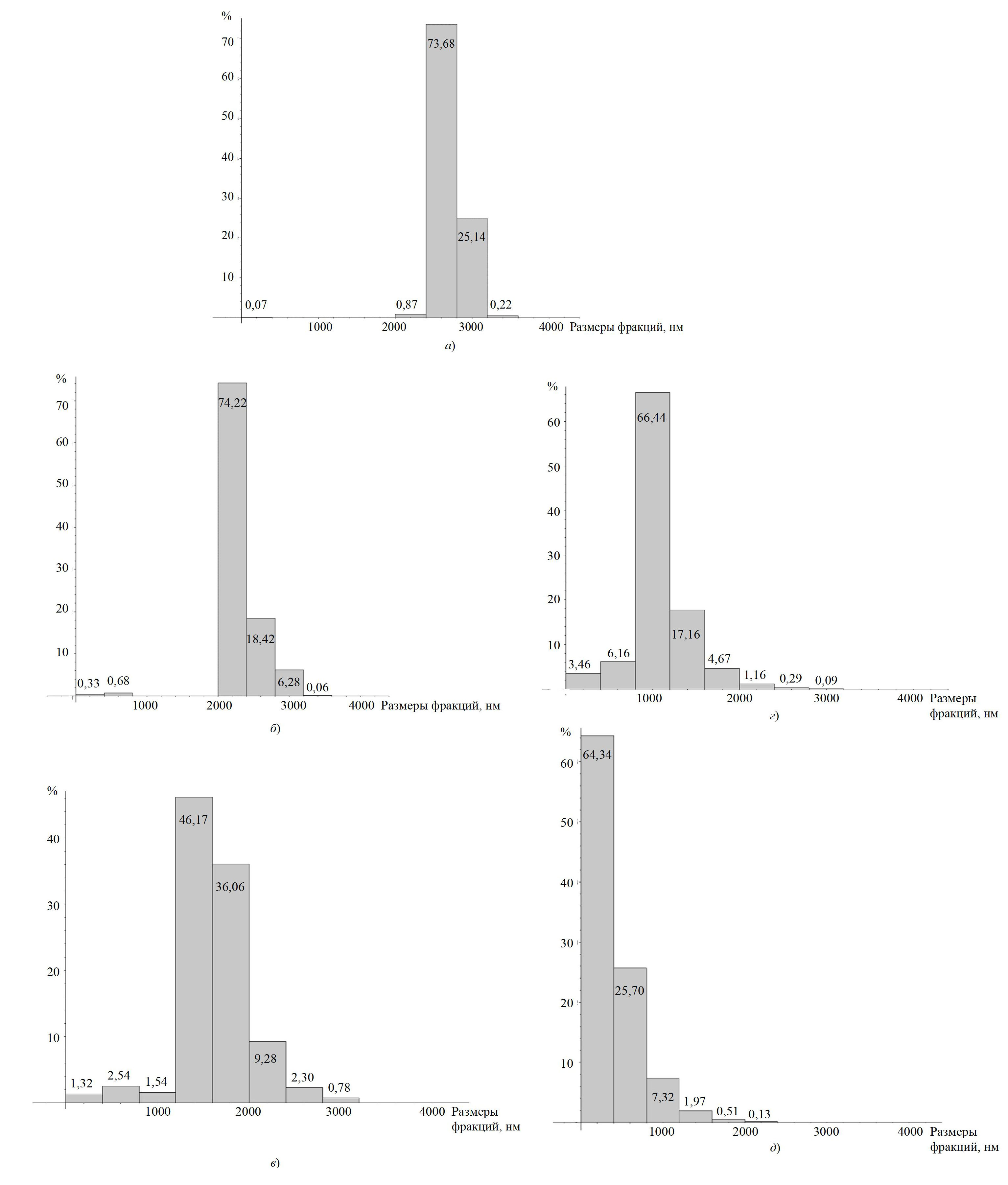Рис. 3. Гистограммы распределения частиц по ячейкам в процессе эксфолиации после циклов обработки (начало): а – 1, б – 3; в – 6, г – 9, д – 13
