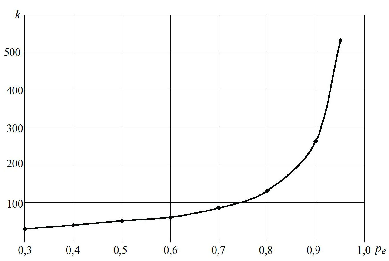 В первой серии численных экспериментов исследовали влияние р(е) на кинетику процесса и использовали следующие данные: интервал распределения исходных частиц 0…4000 нм; исходное распределение по фракциям соответствует параметрам плотности нормального распределения μ = 3000, σ = 200; зазор соответствует номеру фракции 30, где среднее распределения f [30] = 2900…3000 нм. На рисунке 4 показана зависимость числа переходов k, которые необходимо совершить для того, чтобы более 60 % массы частиц оказались в первой фракции, то есть имели размер от 0 до 100 нм.