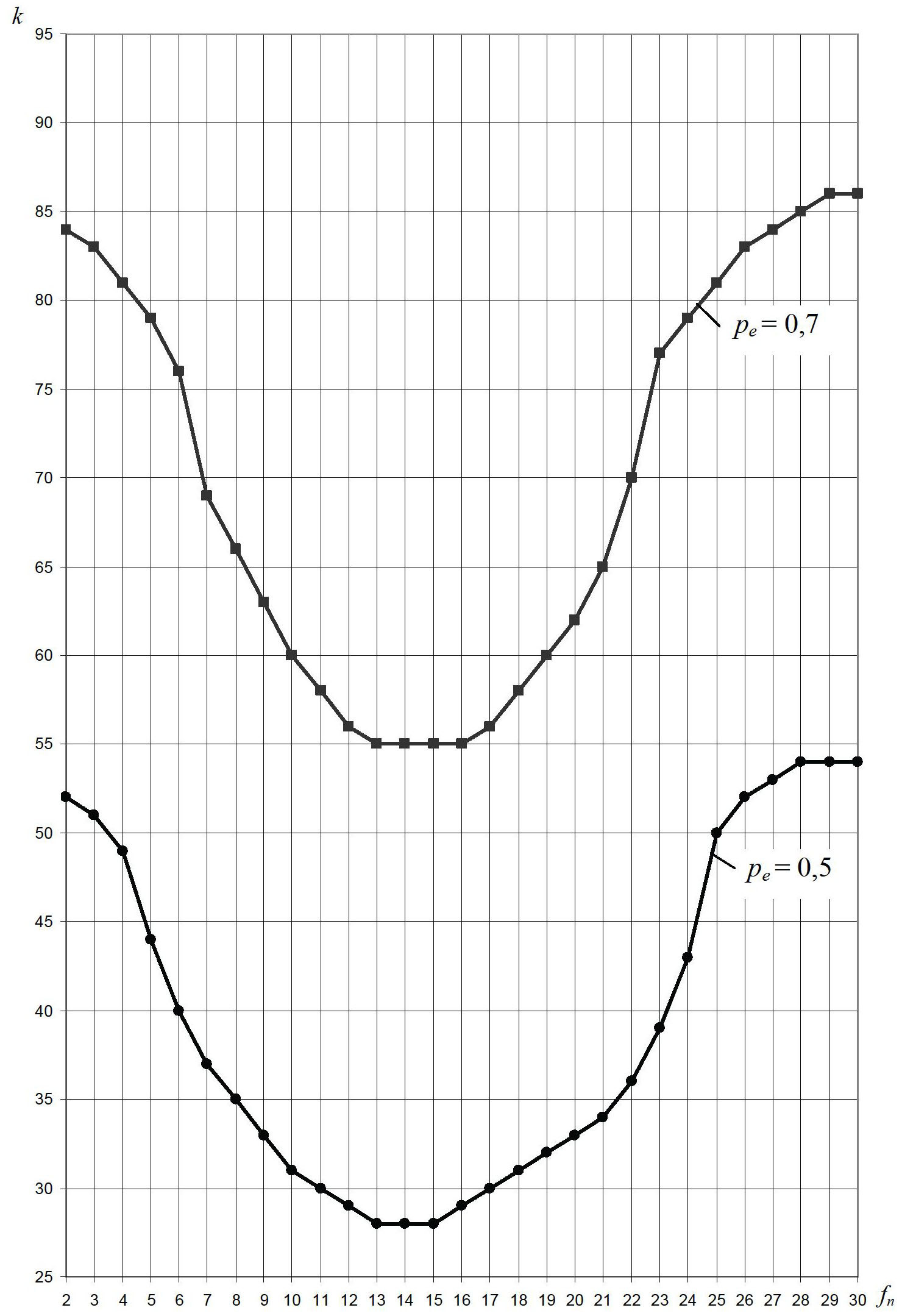 Рис. 5. Зависимости числа переходов k до окончания процесса от номера фракции, соответствующей начальному зазору fn
