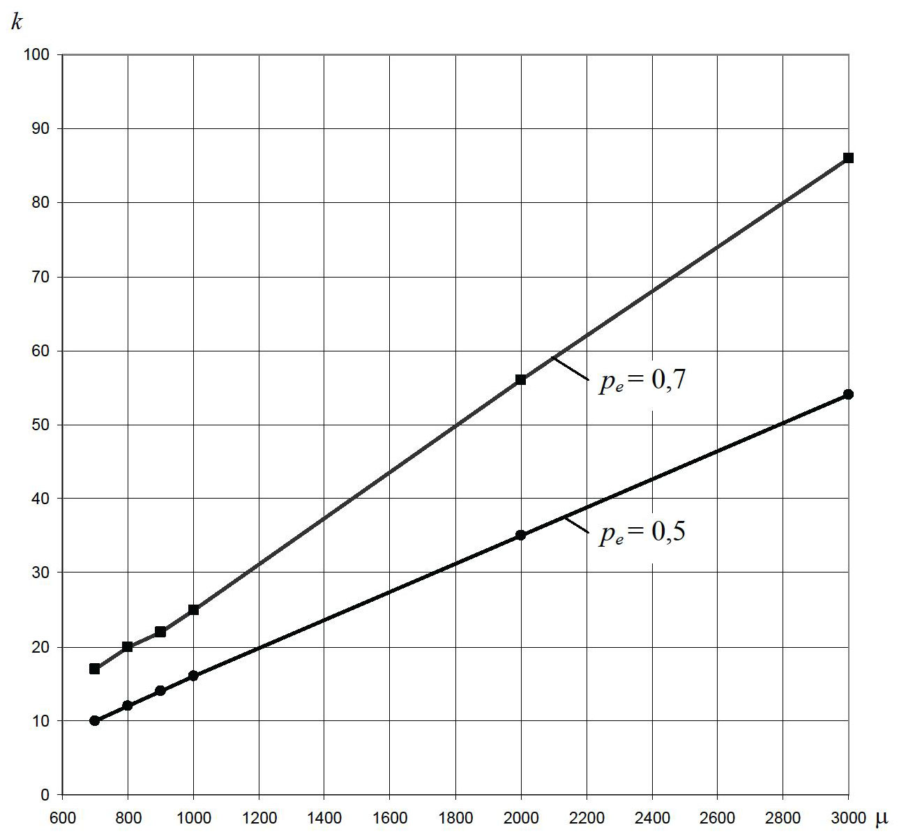 В третьей серии численных экспериментов исследовалось влияние исходного распределения частиц по размерам на продолжительность процесса эксфолиации. На рисунке 6 показаны зависимости продолжительности процесса эксфолиации k от среднего размера частиц в исходной суспензии μ. Из графиков видно, что с увеличением среднего размера частиц, время процесса увеличивается. Данный факт говорит о том, что для приготовления исходной суспензии необходимо использовать графит с минимальным размером частиц.