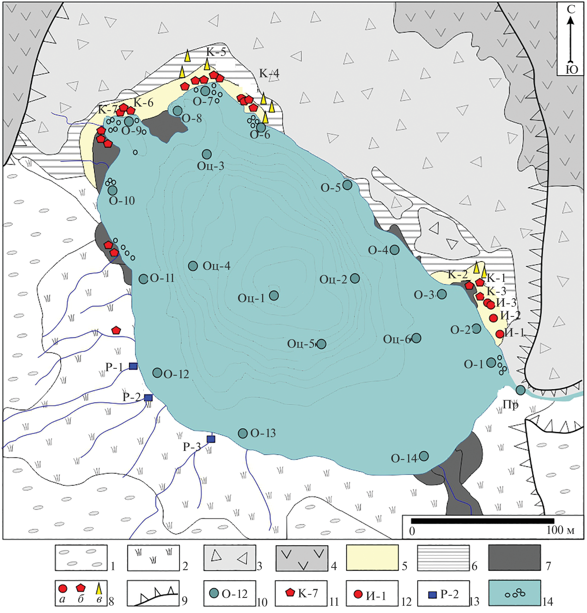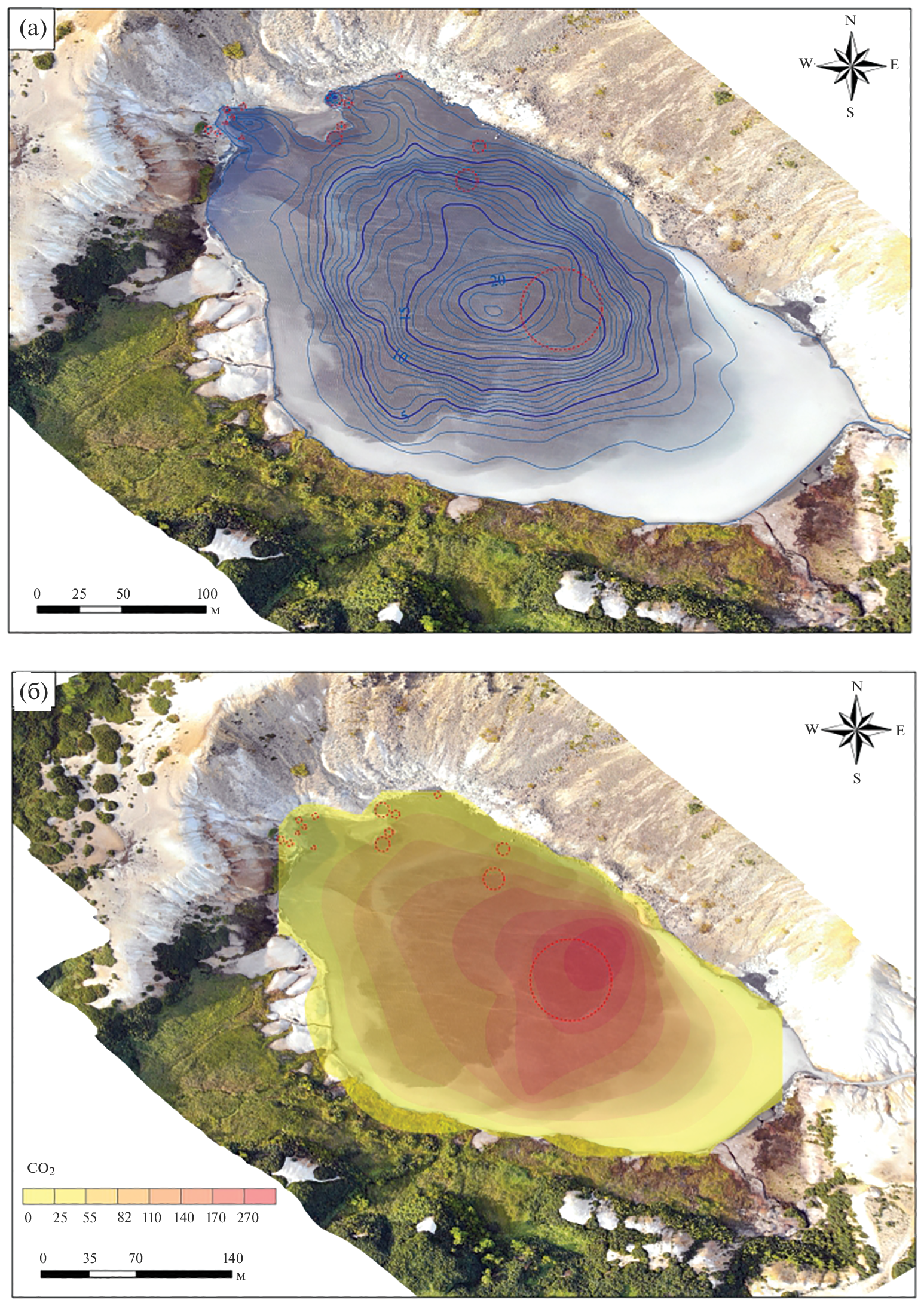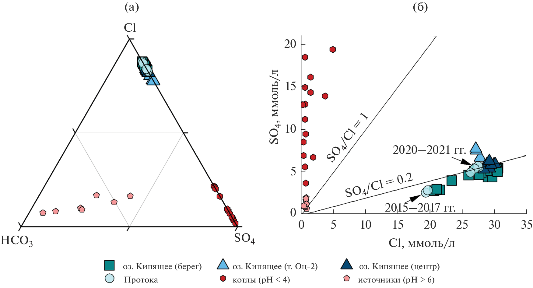 Lake Kipyashchee (Boiling) with an area of ~4.6 ha and a maximum depth of 25 m fills the explosion funnel near one of the extrusive domes of the Golovnin volcano caldera. The water of the lake is ultra-acid (рН = 2.2–2.5) of the chloride-sulfate type with a mineralization of 2.0–2.2 g/l. The water temperature on the surface varies from 30 to 100°C, the average is 37°C. The flow of the lake is carried out through the Protoka in the lake Goryachee (Hot) is 120 l/s (August 2021). The hydrothermal output of magmatic Cl and S (as SO4) from Lake Kipyashchee is 10 t/day and 5.4 t/day, respectively. For the first time, the total diffusive removal of carbon dioxide from the surface of Lake Kipyashchee was estimated as 5.4 tons/day. Obtained from the results of field work in 2020–2021 geochemical data indicate an increase (compared to 2015) in hydrothermal activity in the Golovnin volcano caldera.