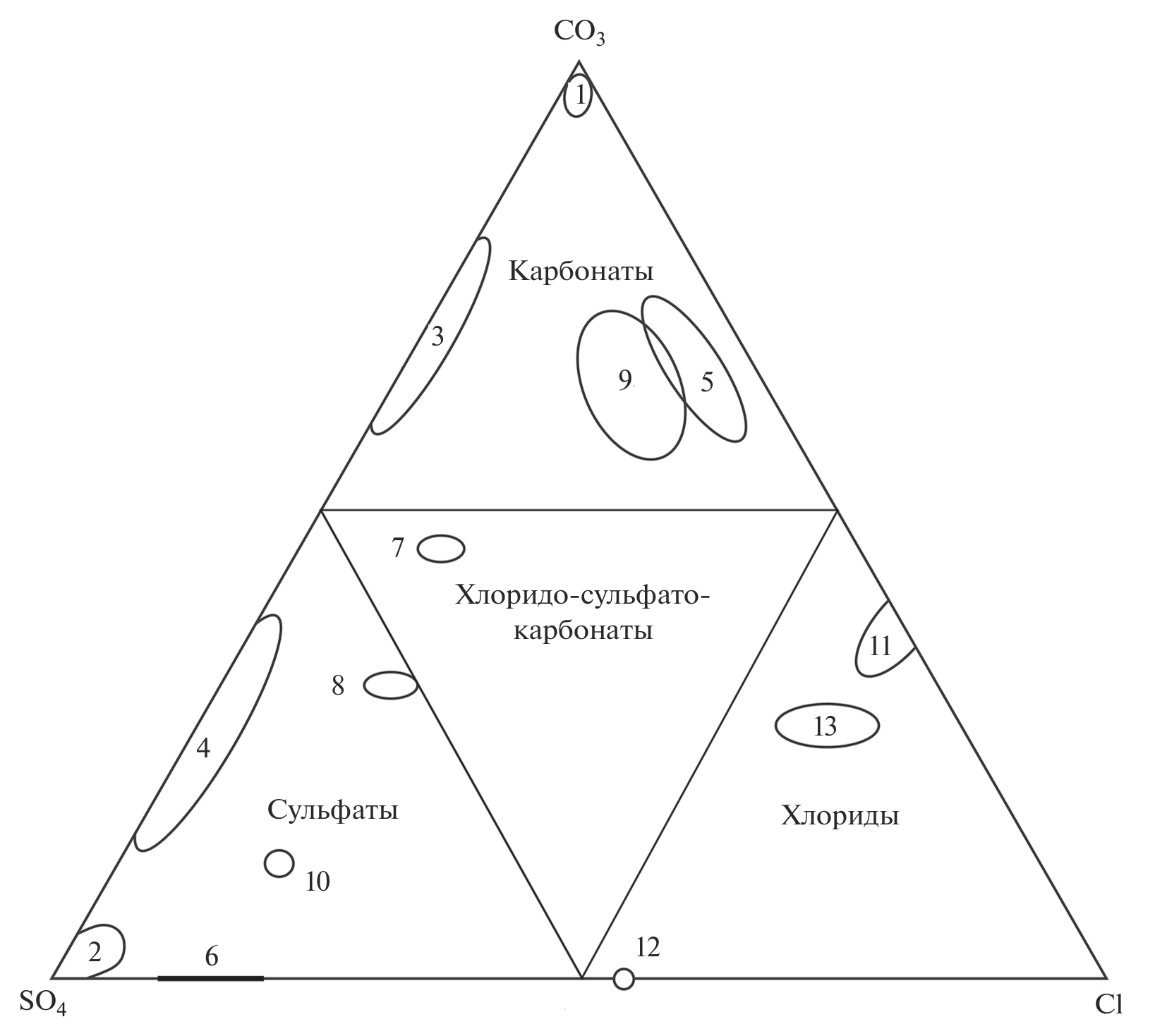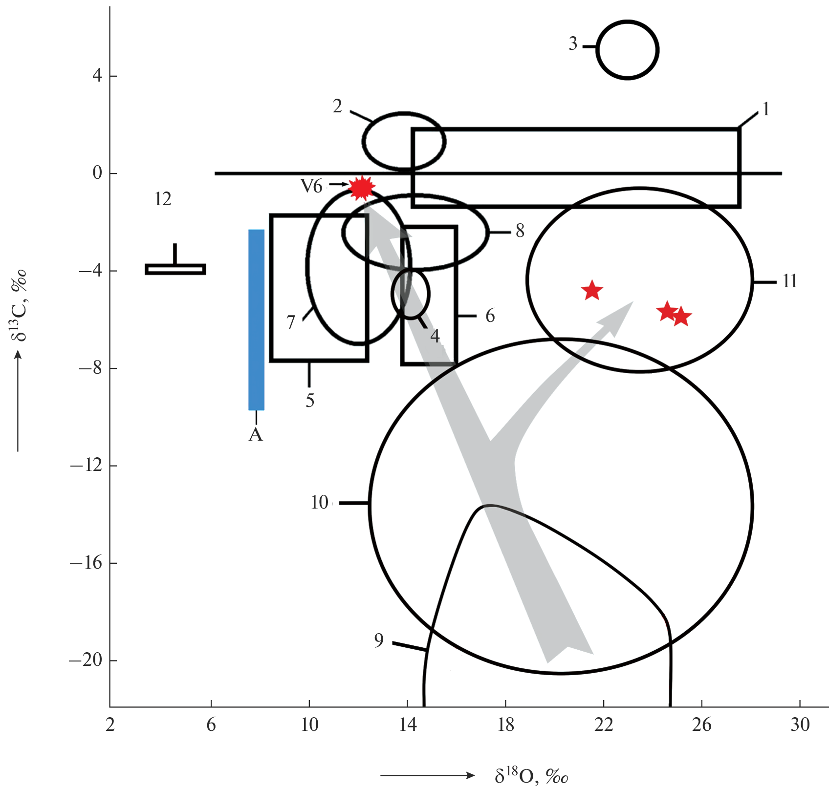 Microxenoliths of sedimentary-marine carbonatoliths in fumaroles of the crater zone of the Second Cone of the BTFE Northern Breach, which were exposed to exhalative-pneumatolytic fluids with the formation of many compounds with mixed carbonate-sulfate-chloride anionic radicals, which are considered as two interclass and nine intertype crystal chemical hybrids, are studied at the expense of carbonates. The pattern of heterogeneity of mineral parasteresis revealed in the altered microxenoliths is interpreted by us as the result of a successive epigenetic transformation of primary carbonates, first into sulfate-carbonates, then into carbonate-sulfates, and then into chloride-carbonate-sulfates and chlorides. Judging by the absence of signs of phase heterogeneity, the investigated crystal-chemical hybrids are homogeneous solid-phase mixtures of carbonates, sulfates, and chlorides in different proportions. The carbonates in microxenoliths in terms of carbon isotope composition (δ13СPDB = –5.34 ± 0.62‰) and oxygen (δ18OSMOW = 24.09 ± 1.05‰) correspond to carbonates of sedimentary-marine limestones redeposited under conditions of volcanic transport. The isotopic composition of sulfate sulfur (δ34S = 1.5–2‰) varies within the range of fluctuations established for sulfates of volcanogenic origin. In carbon particles associated with microxenoliths, the isotopic compositions of carbon (δ13CPDB = –27.37 ± 2.97‰) and nitrogen (δ15NAir = 6.74 ± 2.48‰) tend to be similar to the mode of distribution of such values in the products of modern continental volcanism. The identified crystal-chemical hybrids are a typomorphic feature of the fumarous-exhalative facies and are considered as a previously unknown phenomenon of modern volcanism.