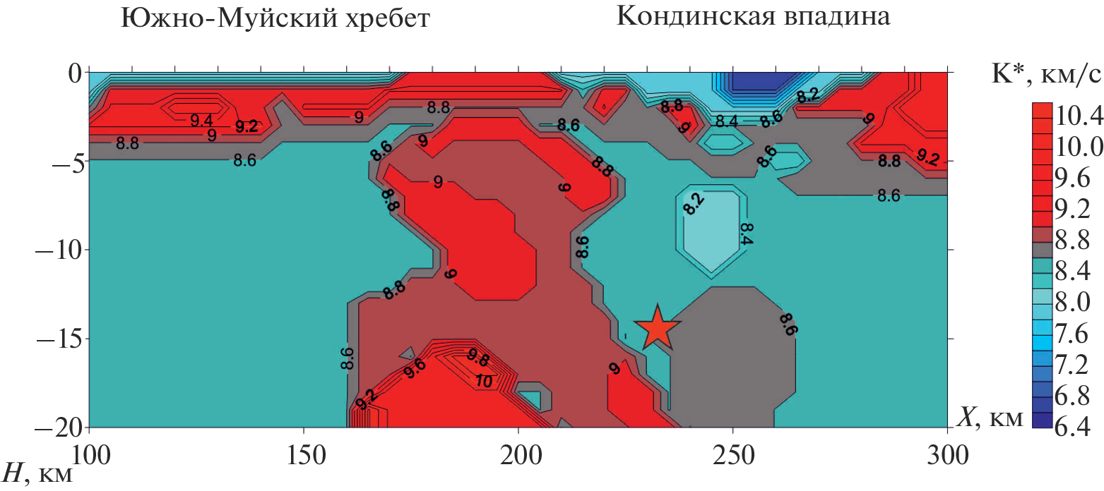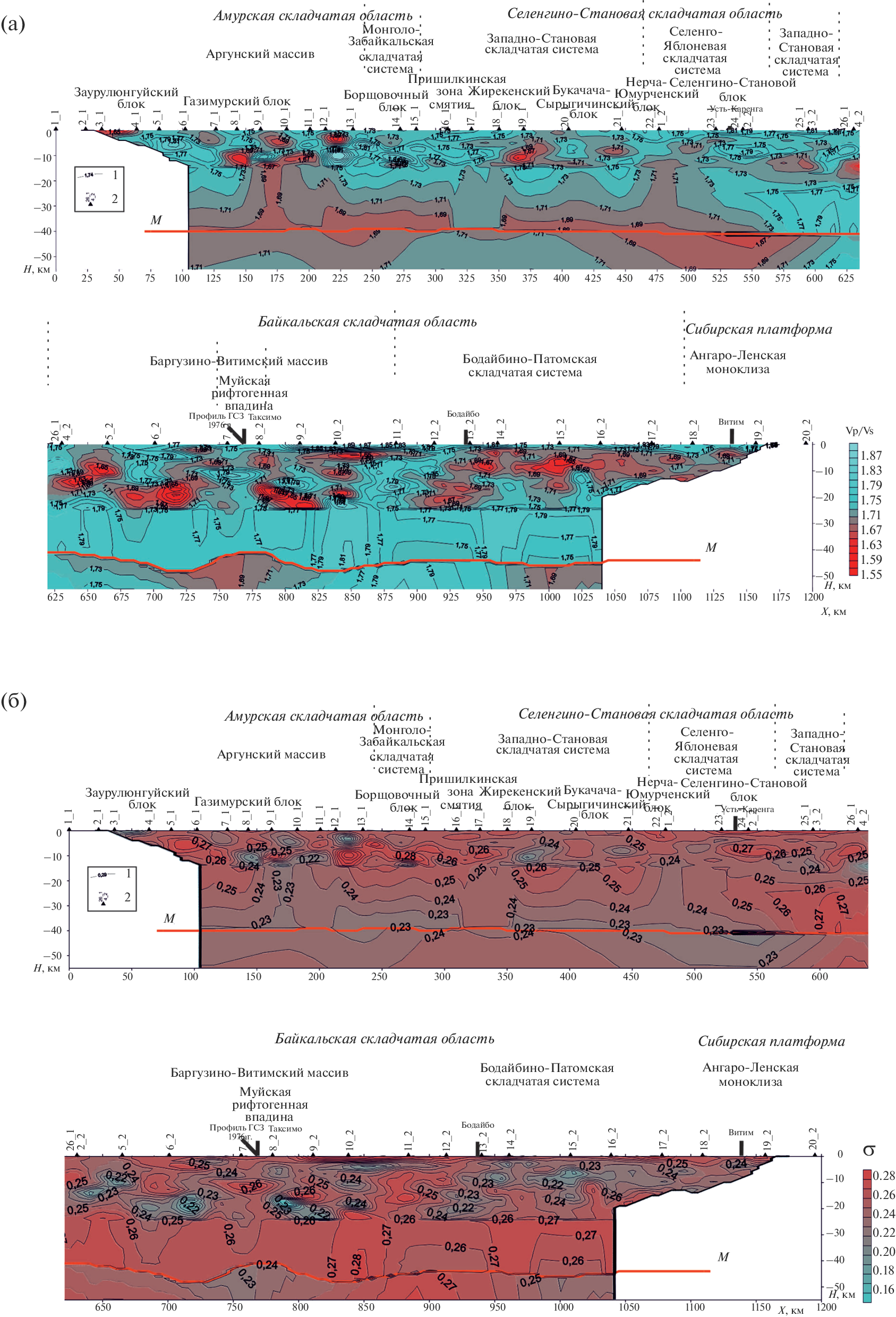 Представлен анализ сейсмичности и глубинного строения Забайкалья в створе опорного геофизического профиля 1-СБ. Установлено сложное неоднородное строение земной коры и верхней мантии. Мощность земной коры изменяется от 40 км в юго-восточной части профиля и на участках межгорных впадин в северо-западной части до 48 км на участках горных хребтов. Сильно изменяются и значения граничных скоростей по границе М от повышенных значений в 8.4‒8.5 км/с для Р‑волн и 4.9‒4.95 км/с для S-волн (в особенности в юго-восточной части профиля) до пониженных значений в 7.8‒8.0 км/с для Р-волн и 4.6‒4.7 км/с для S-волн на участке Байкальской рифтовой зоны в северо-западной части профиля. Сильное неоднородное строение среды по значениям скоростей упругих волн, отношениям скоростей Vp/Vs и коэффициенту Пуассона установлено для верхней и средней коры на глубинах 8‒20 км. Установлена приуроченность зон повышенной сейсмичности к блокам земной коры с неоднородным скоростным строением по данным разнополяризованных Р- и S‑волн. Повышенной неоднородностью в верхней части земной коры по данным скоростей упругих волн и вторичных параметров среды (отношениям Vp/Vs, параметру K* = Vp/(γ ‒ 1), где γ = Vp/Vs, коэффициенту Пуассона (σ)) характеризуется район Байкальской рифтовой зоны, в непосредственной близости от крупнейшего Муйского землетрясения 1957 г. с М = 7.6. Выделен в створе профиля также ряд других неоднородных глубинных зон по аномалиям скоростей Р- и S-волн и вторичных параметров среды, в разной степени коррелирующих с сейсмоактивными участками по данным многолетних инструментальных наблюдений. Установленная однозначная связь крупных неоднородных зон верхней коры Забайкалья с накоплением напряжений и их разрядкой в виде сильных землетрясений позволяет делать обоснованным среднесрочный прогноз катастрофических событий.