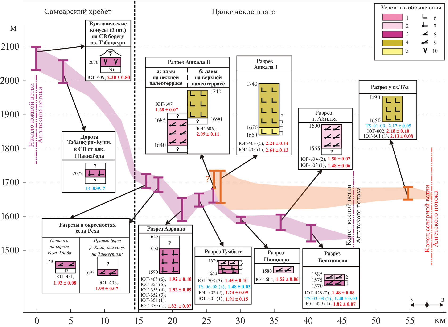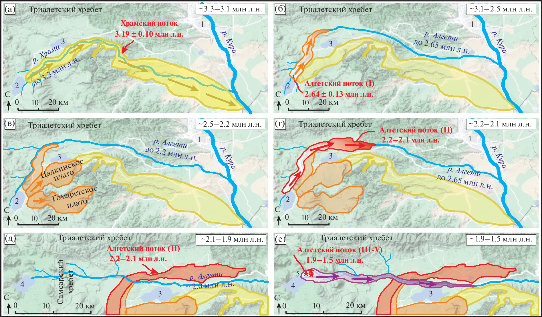 The article presents new results of geological-stratigraphic and isotope-geochronological study of young lavas in the northeast part of the Javakheti Highland (Lesser Caucasus, Republic of Georgia). A valley lava river (Algeti flow) with a complex structure and total length about 55 km was described for the first time (no information about this valley lava river was previously published in the scientific literature). It was shown that a young magmatism in the northeast of the Javakheti area developed in the time interval of 3.2–1.5 Ma. Its early phase (3.19 ± 0.10 Ma) was marked by the formation of the longest (up to 100 km) valley lava river (Khrami flow), composed of basalts, among the similar geological objects known in the Lesser Caucasus. Subsequently (2.7–2.5 Ma), the continuation of eruptions led to the formation of extensive lava plateaus in the region (Tsalka, Gomareti and others). The formation of the Algeti valley lava river (Algeti flow), composed of basaltoids, began from the end of Piacenzian and continued over ~1 m.y. until the beginning of Gelasian (2.7–2.0 Ma) as a result of the activity of volcanoes in the northern part of the Javakheti Range. The final stage of formation (1.9–1.5 Ma) of Algeti flow was likely associated with eruptions of volcanic cones near Tabatskuri Lake. The obtained data, along with the reconstruction of the history of young magmatism, made it possible to follow the main features in the formation of modern relief and the river valley system in the considered part of the Lesser Caucasus.