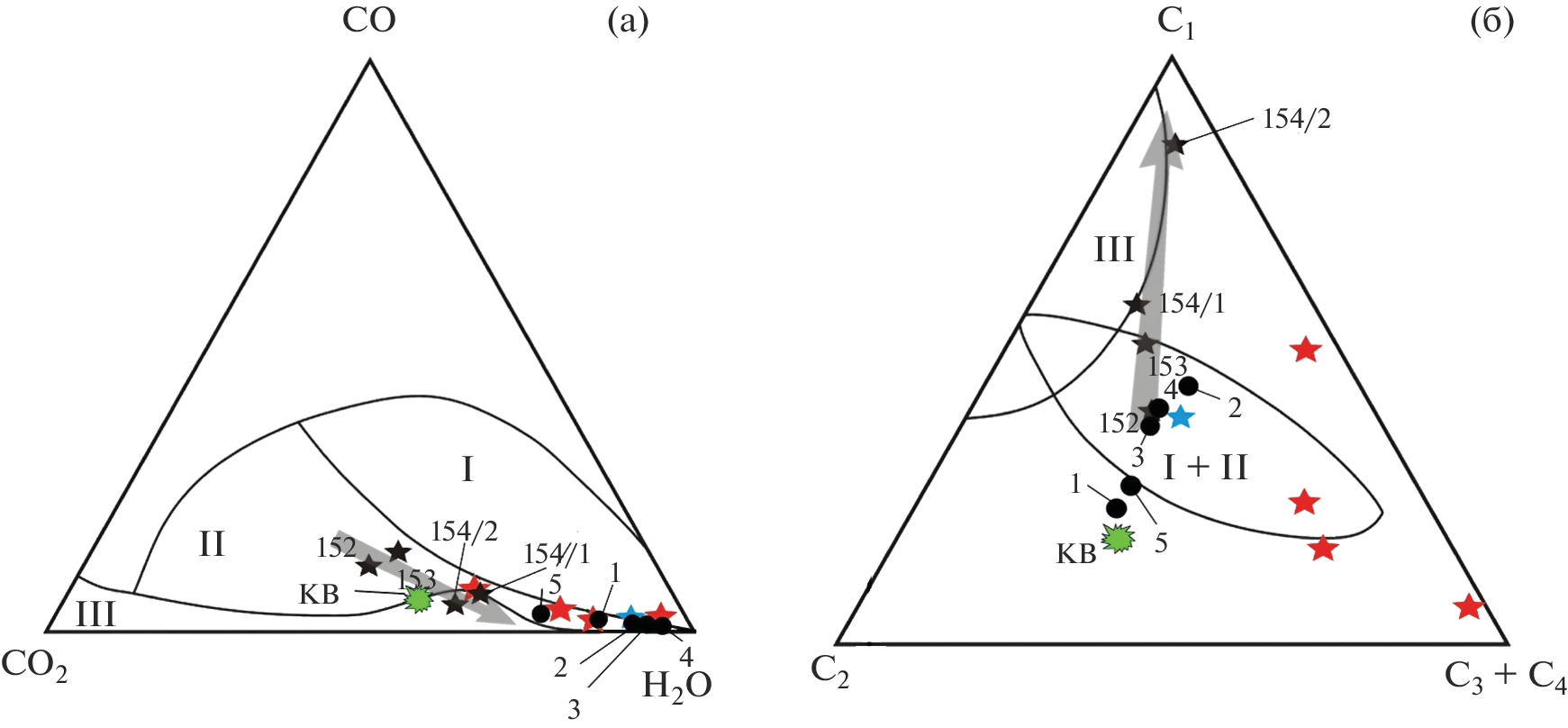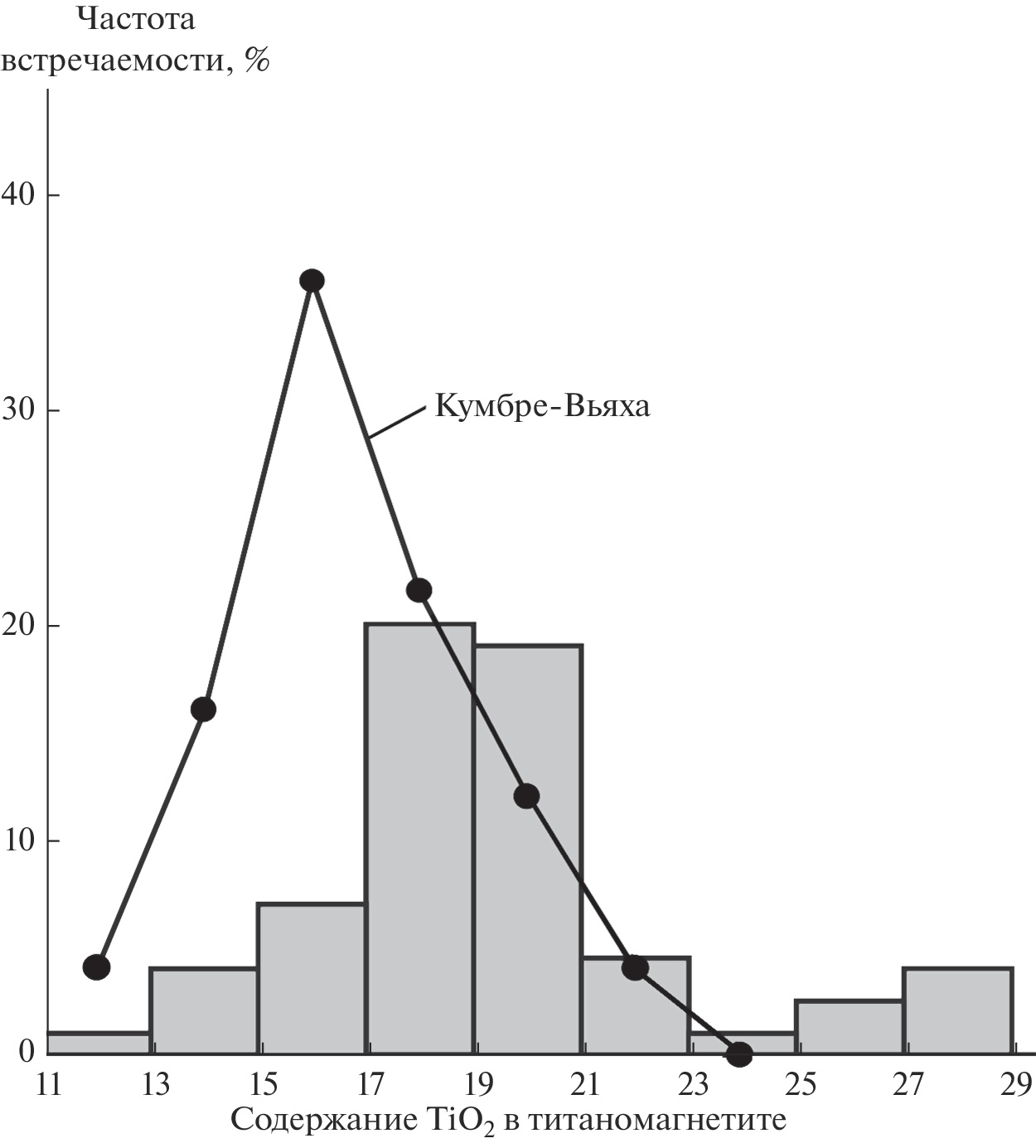 Comprehensive mineralogical and geochemical studies of a representative sample of tephra from the Cumbre-Vyaha volcano (2020–2021 eruption), which has a gravel-psammitic granulometric composition and is characterized by an anomalously high degree of particle vesicularity, have been carried out. In terms of bulk chemical composition, this tephra corresponds to the transition from alkaline picrobasalts to alkaline basalts, differing fundamentally from the tephra ashes of marginal continental volcanoes. The studied tephra contains 45 trace elements with a total content of up to 2333 ppm, which exceeds that in the tephra of island-arc volcanoes. According to the ratio of geochemical criteria, tephra from Cumbre-Vyaha correspond to the average values for within-plate volcanoes in the oceans. The geochemical feature of the studied tephra is a strong enrichment in lanthanides, noble and platinoid metals. H2, CO, CO2, H2O, CH4, C2H4, C2H6, C3H6, C3H8 were found in the composition of the lithogenic gas phase separated by heating from the studied tephra. The proportions between inorganic components in the gas phase generally correspond to the boundary region between crustal and mantle-crustal derivatives, but a relatively low water content is found. Olivine of composition Fo73–84, essentially diopside clinopyroxene, andesine-bytovnite plagioclases, chrome spinels, phase-homogeneous solid solutions of ilmenite in magnetite, phases of Ni-Cu-bearing native iron, quartz, and sodium hydroxyl chlorides were identified and studied in microlites. In addition, dispersed carbon matter with carbon isotopic composition δ13СPDB = –30…–24‰ was found in the Cumbre-Vyaha tephra, which corresponds to the carbon isotope composition in abiogenic carbonaceous substances of volcanic origin. The totality of the results of mineralogical and geochemical studies characterizes the Cumbre-Vyaha volcano as a typical representative of within-plate oceanic plume volcanoes.