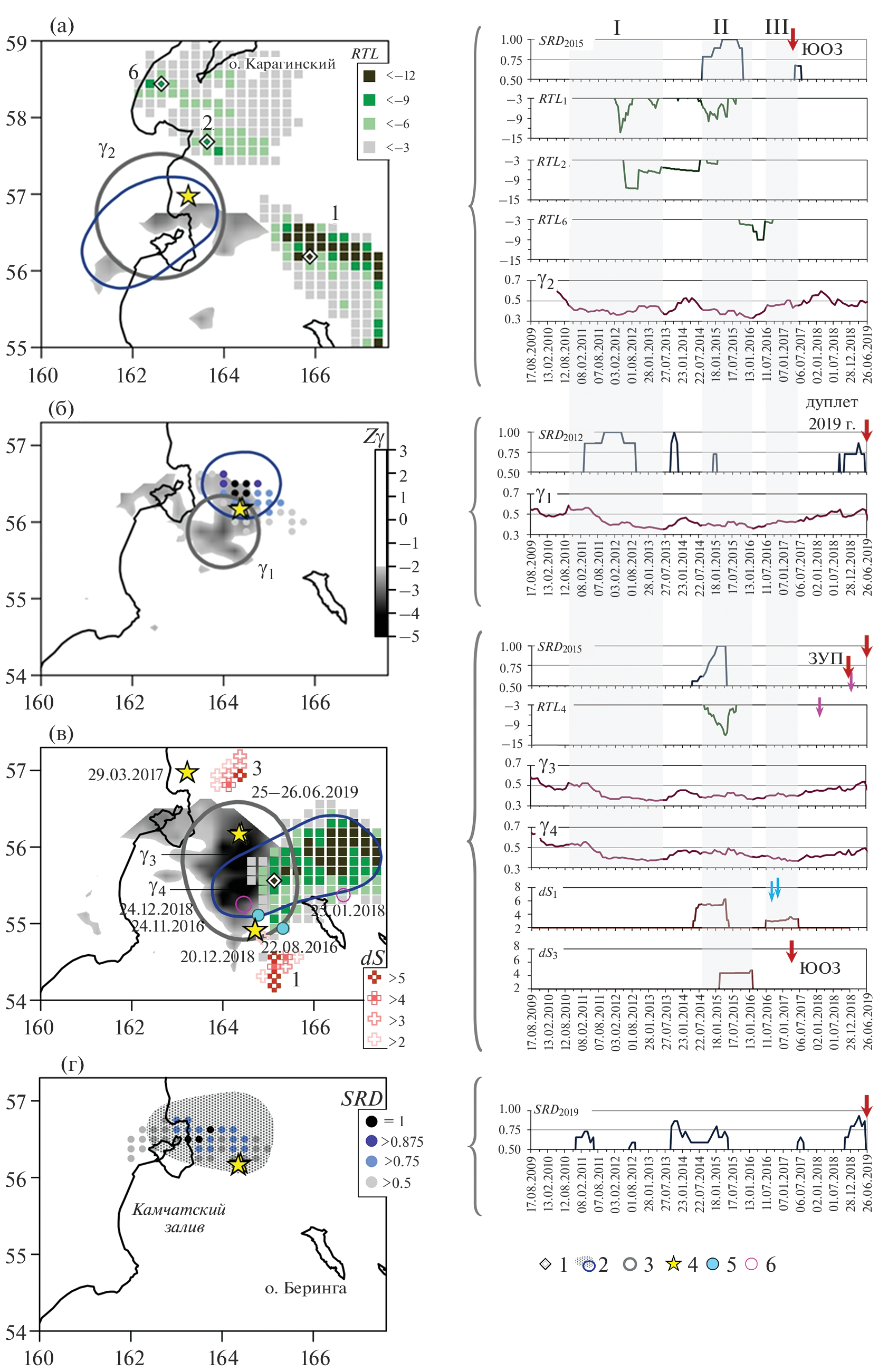 The article describes the behavior of the series of seismic precursors before the activation of 2016‒2019 in an area with a tectonically complex geodynamic environment at the boundaries of the Pacific, North American, and Eurasian lithospheric plates. In order to clarify the location of possible focal areas of future strong earthquakes, a comprehensive approach to the application of allocated precursors was considered: quiescence by parameters RTL and Z-function, variations of the slope of the recurrence graph γ and areas of seismic ruptures dS. For the first time, in relation to Kamchatka, for anomalies to parameter dS, interpreted as seismic activations, the presence of a predictive component before the onset of foreshock activation is shown by the example of an increase in its values before the events that are the strongest for the areas where their focal areas are located: the Near islands Aleutian earthquake with Mw = 7.8 on July 17, 2017 and the Uglovoye Podnyatiye earthquake on December 20, 2018, Мw = 7.3, is demonstrated. The total length of the anomalous region, currently existing and including successive stages of quiescences and foreshock activations is ~900 km, which allows for the possibility of a new strong earthquake with a magnitude exceeding all previously recorded in this area in the junction zone of three lithospheric plates.