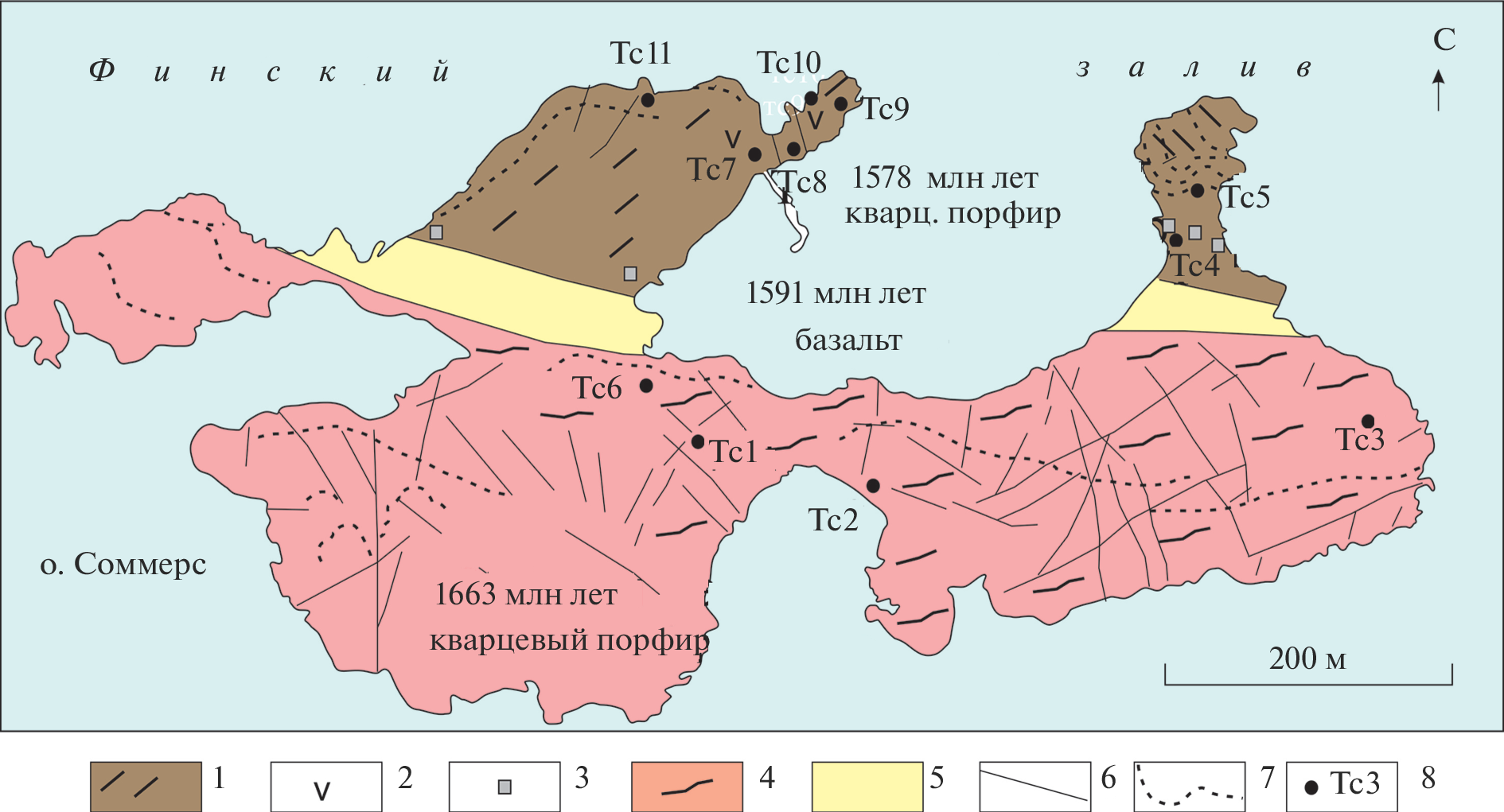 The article presents new petrogeochemical data of rocks from the area of the Outer Islands of the Gulf of Finland. Previously, quartz porphyries of Gogland Island were considered as a standard of volcanic comagmates of Rapakivi granite of the Vyborg massif. There are two effusive tolshas on Sommers Island. The “Southern” is composed of quartz porphyries, with an isotopic age of 1.66 Ga old, so they can be considered as the earliest manifestations of Riphean magmatic activity in this area. In addition to quartz porphyries, trachybasalts, andesibasalts, and dacites are present in the “Northern” strata, and its isotopic age is 1.59‒1.57 Ga old, which does not correspond to the values of the nearby Vyborg massif 1.65‒1.63 Ga old. Therefore, despite the pro-ximity of the compositions of quartz porphyry and rapakivi granites, volcanites are not products of differentiation of the magma initial for granites, but were formed independently of them from the same type of source, but in a slightly different structural environment, allowing their free flow to the Earth’s surface.
