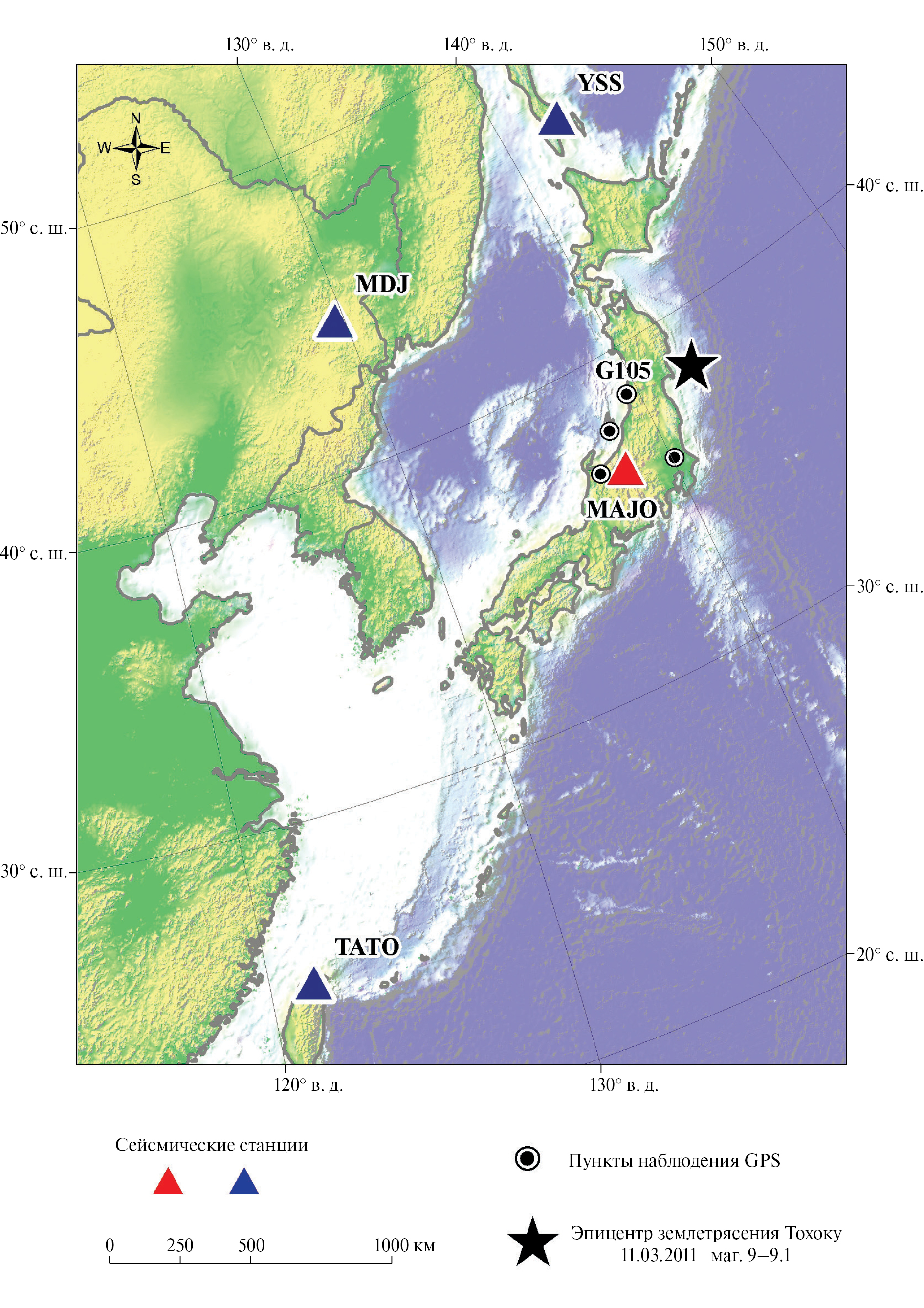 Из базы GSNet_152.dat взяты данные станций, расположенных вокруг эпицентра землетрясения (рис. 1). Мы изучали ежесекундные записи широкополосных сейсмических станций IRIS, оснащенных сейсмометрами STS-1, позволяющими исследовать при одной и той же чувствительности колебания в диапазоне 0.2–360 с [Wieland, Streckeisen, 1982]. Канал LHZ каждой станции регистрирует вертикальную скорость смещения грунта V. Ближайшая к очагу станция MAJO расположена на расстоянии 386 км от эпицентра (Station IU MAJO, Matsushiro, Japan). Сейсмометр установлен на коренных породах о. Хонсю на высоте 405 м от уровня моря в штольне под сопкой. Это, практически, исключает влияние на него ветра и влаги при дожде. В штольне поддерживается постоянная температура.