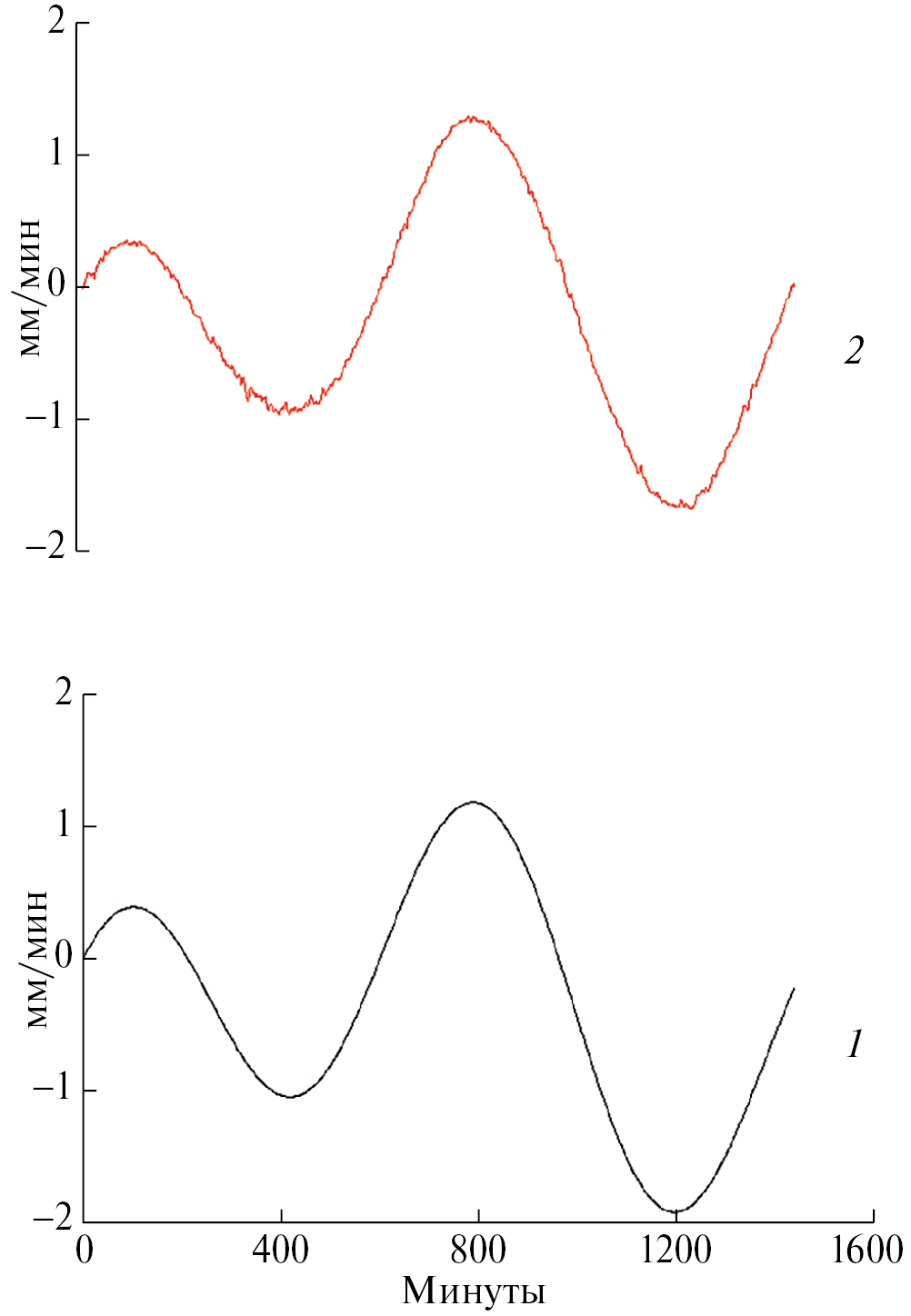 Для сопоставления записей широкополосных сейсмических станций c вариациями земных приливов мы использовали последовательность действий, описанных ниже на примере станции MAJO за 06 января 2007 г. (рис. 2). График 1 представляет ежеминутные значения скорости изменения высоты теоретически вычисленного для координат станции MAJO земного прилива. Применена программа PETGTAB [Wenzel, 1999]. График 2 демонстрирует вариации колебаний по сейсмологическим данным. Исходные ежесекундные данные получены по системе ИНТЕРНЕТ (http://ds.iris.edu/ds/nodes/dmc/forms/breqfast-request) и усреднены до минутных величин. Шкала сейсмических данных приведена нормировкой к такой же для значений прилива. Коэффициент корреляции значений графиков 1 и 2 составляет 0.99. Это свидетельствует о возможности использования записей широкополосных сейсмических станций для изучения вариаций земных приливов в минутном диапазоне периодов.