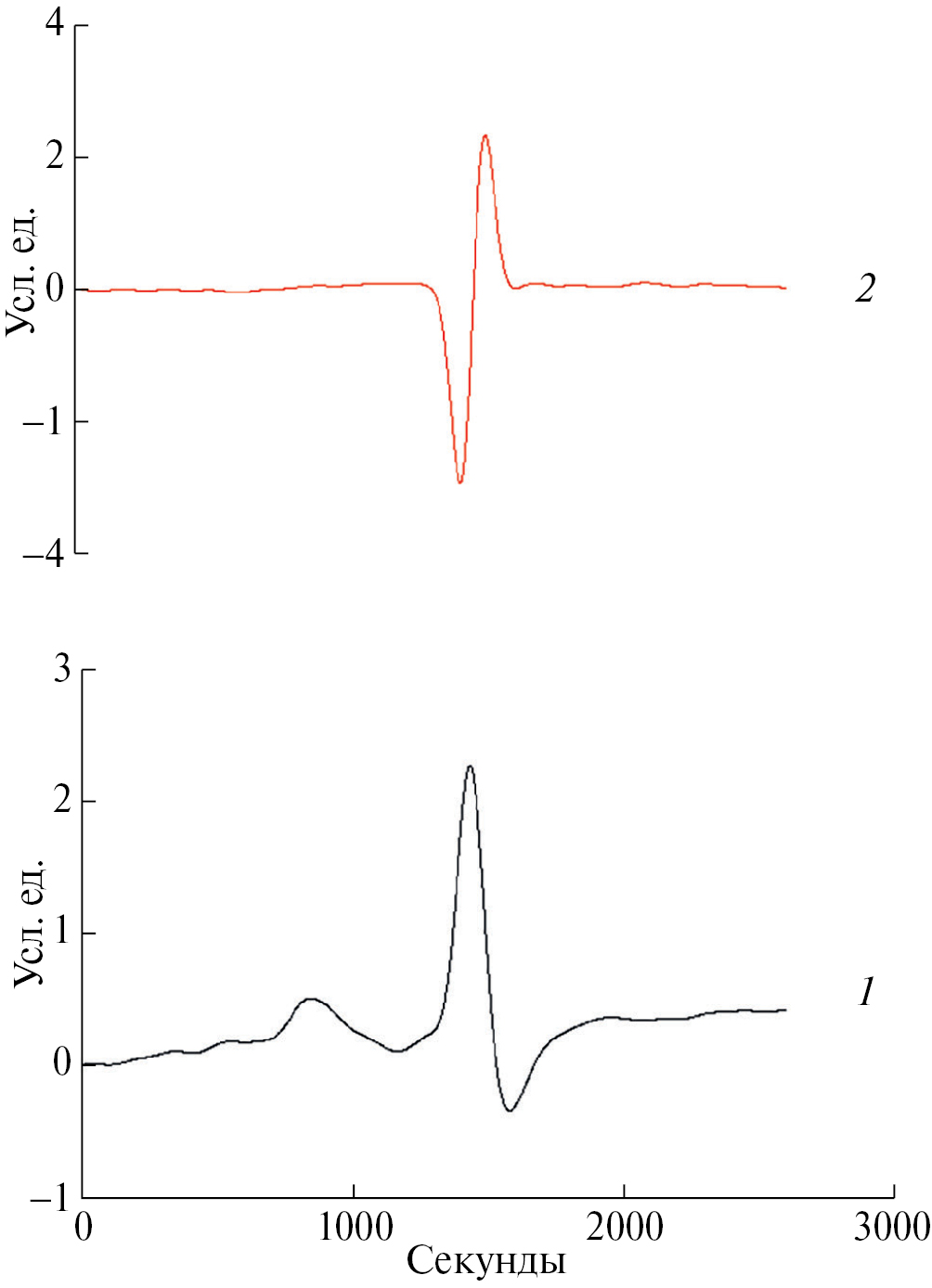 Начиная с 2007 г. в записях станции MAJO стали появляться однополярные импульсы с амплитудой больше 10% от размаха приливных колебаний. Пример такого импульса 2 февраля 2007 г. показан на графике 1 рис. 3. Его длительность составляет примерно 300 с, и он четко прописывается сейсмометром STS-1, плоская амплитудно-частотная характеристика которого простирается от 0.2 с до 360 с. В апреле 2006 г. на станции MAJO был установлен еще сейсмограф STS-2 с полосой пропускания до 100 с. Он воспроизводит более низкочастотные импульсы типа графика 1 с искажениями, что видно на графике 2. Но одновременное появление сигналов на двух приборах указывает, что сигналы не вызваны аппаратурными погрешностями какого-то сейсмографа.