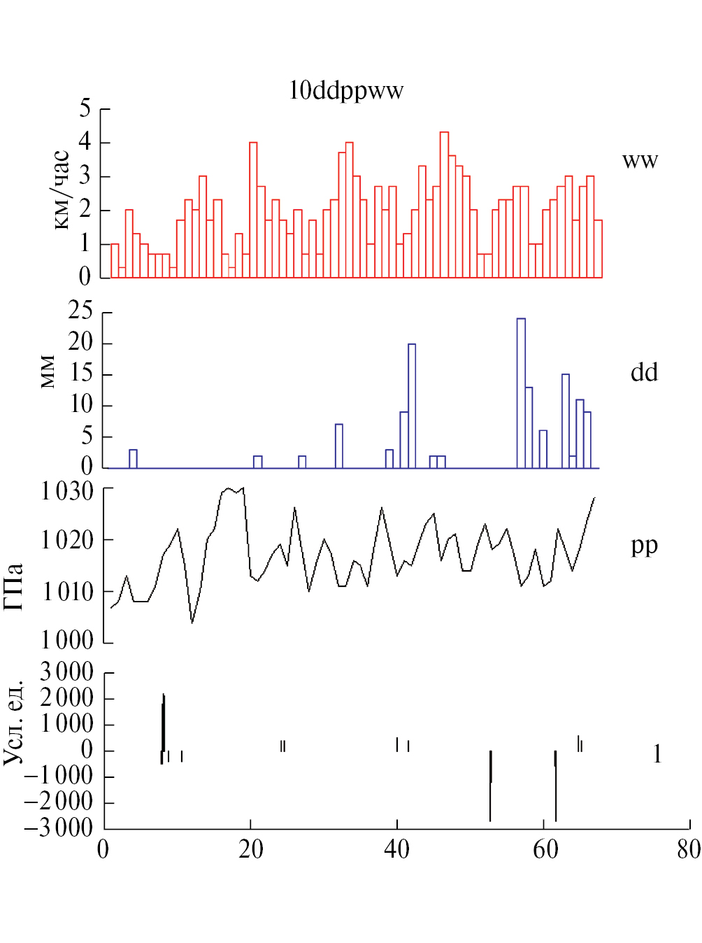 Рис. 7. Сопоставление времен появления сейсмических импульсов на станции MAJO (1) с вариациями атмосферного давления pp, количества выпадения осадков dd и скорости ветра ww на близлежащей метеообсерватории в интервале 1 января–10 марта 2010 г.