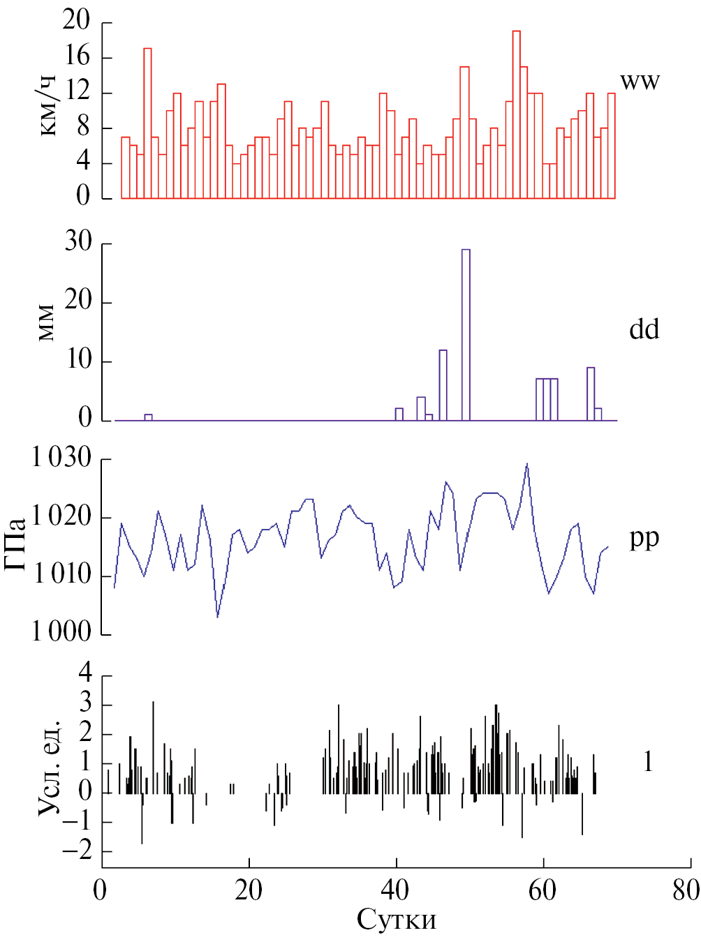 Для выяснения возможной природы импульсов были исследованы погодные условия в районе станции MAJO, так как ранее было показано [Соболев и др., 2022], что такого типа сигналы возникают, например, при выпадении дождя. На рис. 6, 7, 8 приведены сведения за 68 дней (с 1 января по 10 марта) по атмосферному давлению, выпадению осадков и скорости ветра на метеорологической станции MATSUMOTO [36.14 с.ш., 137.58 в.д.]. Она расположена на расстоянии менее 10 км от MAJO. В 2009 г. (см. рис. 6) было 2 дня с большим количеством осадков: 30 января и 6 марта. В течение первого из них импульсов вообще не было (график 1), а во втором случае импульсы появились за сутки до выпадения дождя. В 2010 г. большие по амплитуде импульсы произошли практически в дни без осадков. Обильное выпадение осадков 7 февраля 2011 г. (см. рис. 8) не вызвало увеличения числа импульсов. Метеоданные по другим близко расположенным станциям SUWA [36.02 с.ш., 138.06 в.д.], NAGANO [36.39 с.ш., 138.11 в.д.], TAKAYAMA [36.09 с.ш., 137.15 в.д.], TOYAMA [36.42 с.ш., 137.12 в.д.] подтвердили выводы по станции MATSUMOTO.