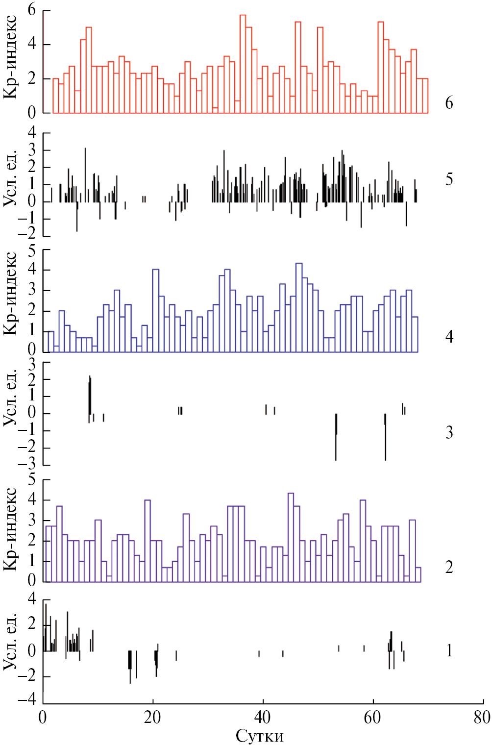 Еще одним природным явлением, способным вызвать сейсмические импульсы, является магнитная буря. В работе [Соболев и др., 2020] было показано, что импульсы длительностью в несколько минут возникают практически сразу после резких изменений напряженности магнитного поля на всех континентах. В связи с этим мы проверили уровень геомагнитной активности в интервалах 1 января – 10 марта 2009, 2010, 2011 гг. Сведения о сильных магнитных бурях получены из архива http//www.spaceweatherlive.com. В таблицах архива приведены значения планетарных Kp-индексов – отклонений магнитного поля Земли от нормы в течение трехчасовых интервалов соответствующих суток (GFZ Potsdam official Kp-index). Значения Kp-индексов лежат в диапазоне от 0 до 9. Если они превышают величину 5, то такая активность рассматривается как магнитная буря. На рис. 9 графики 2, 4, 6 показывают уровень магнитной возмущенности во время вышеуказанных интервалов анализа импульсов в 2009, 2010 и 2011 гг. (графики 1, 3, 5). В целом, геомагнитная активность, во всех исследованных интервалах была не высокой.