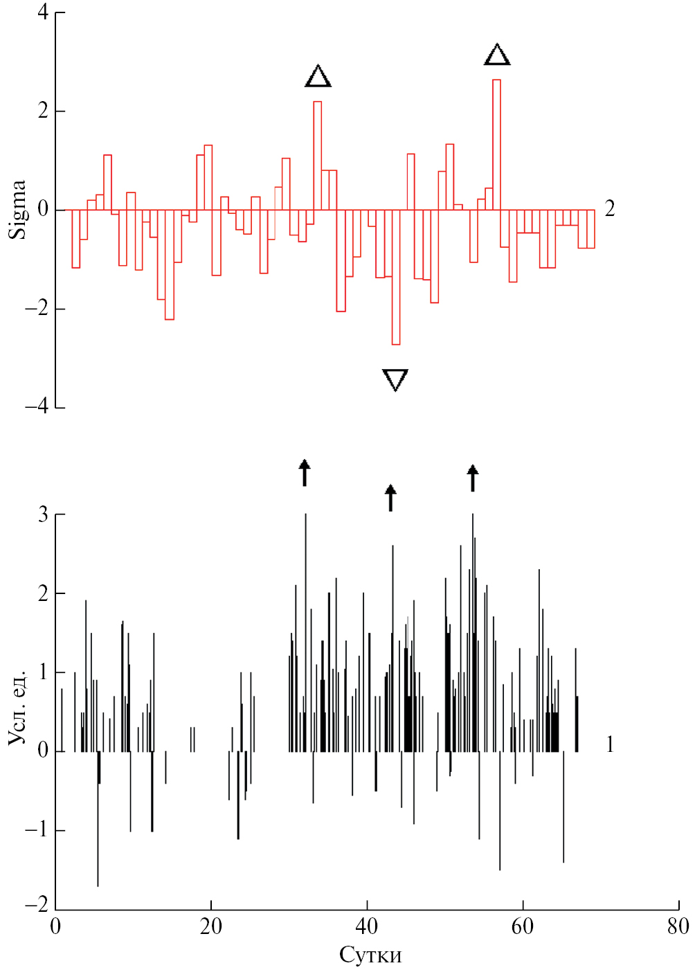 В Японии существует сеть геодезических измерений GPS, включающая несколько тысяч наблюдательных пунктов [http://geodesy.unr.edu/gps_timeseries/tenv3/IGS14/], (Blewitt, Hammond, Kreemer, 2018). Значительное количество таких пунктов было установлено в 2006 г. и увеличено в 2009 г. Это дало возможность сопоставить времена возникновения вышеописанных импульсов с движениями на поверхности Земли. Мы выбрали несколько пунктов, расположенных вокруг сейсмической станции MAJO; их местоположение показано на рис. 1. Сопоставление выполнено для тех же интервалов 1 января – 10 марта 2009, 2010, 2011 гг. Наибольшее внимание, естественно, уделено вертикальным компонентам Z движений пунктов GPS, так как мы изучали вертикальные скорости перемещений земной поверхности V под сейсмической станцией. Только на ближайшем к MAJO пункте GPS (g105) выявлено некоторое сходство повышенных амплитуд вертикальных движений земной поверхности (рис. 10, график 2) с возникновением больших импульсов (график 1). На графике 2 выделяются два выброса: 1 февраля (32 день) с амплитудой среднеквадратичных отклонений 2.2 σ и 26 февраля (56-й день), 2.65 σ (треугольники). Оба они характеризовались повышенными значениями амплитуды импульсов. В целом, не совпадение повышенных значений вертикальных движений по данным GPS и сейсмической станции, возможно, объясняется следующими причинами.