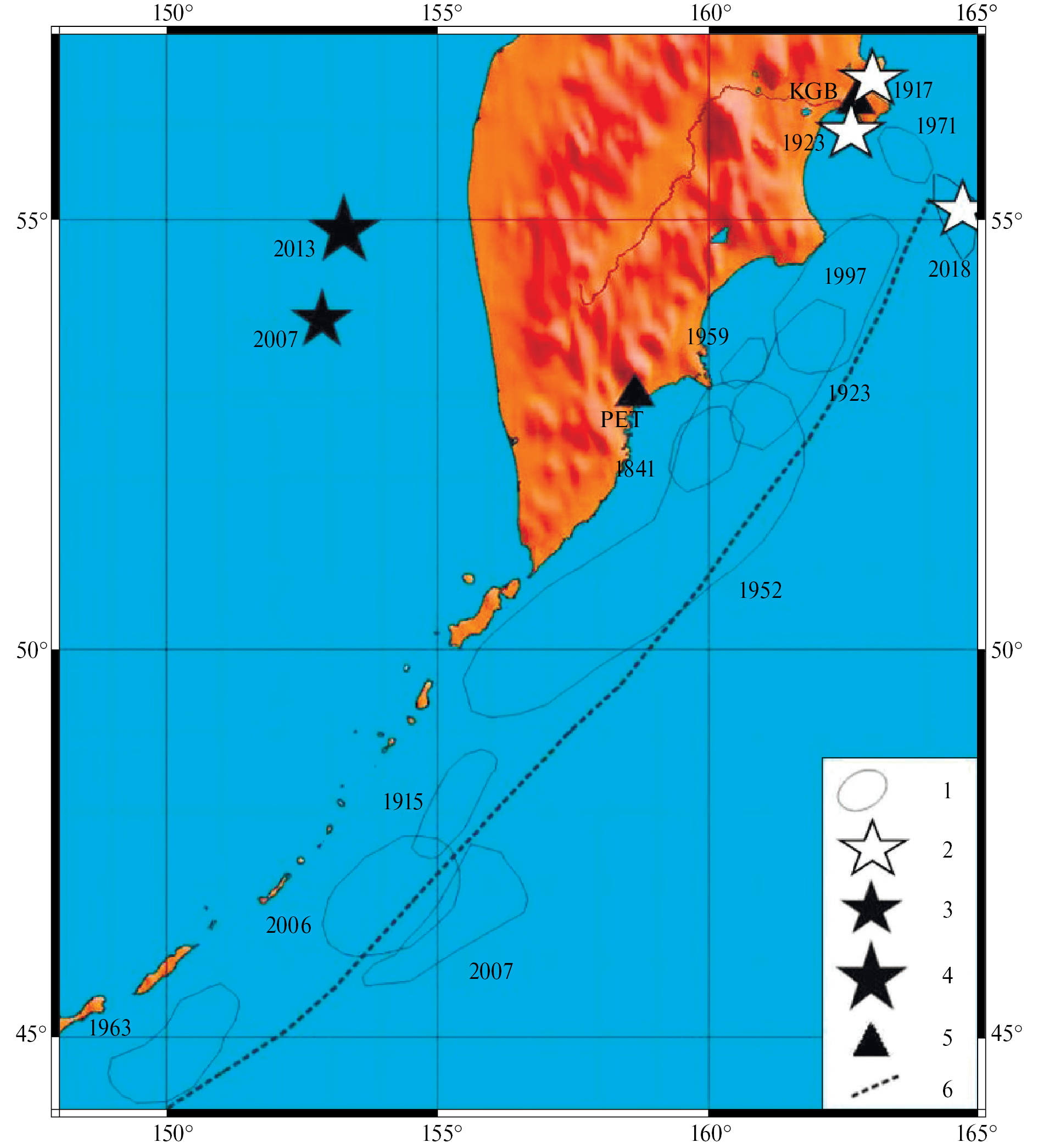 Рис. 1. Карта района исследований. 1 – очаговые зоны сильнейших неглубоких землетрясений (Mw ≥7.8); 2 – эпицентры сильных землетрясений (Mw = 7.2‒7.7); 3, 4 ‒ эпицентры cильнейших глубоких (h >70 км) землетрясений (указаны годы всех событий); 5 – сейсмические станции; 6 – глубоководный желоб.