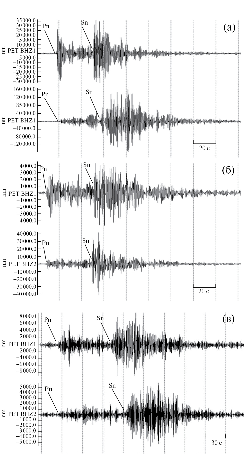 На рис. 2 показаны примеры сейсмограмм землетрясений, полученных станцией PET. Видно, что для эпицентров в области Северных Курил, расположенных в очаговой зоне Великого Камчатского землетрясения на эпицентральных расстояниях ~330–380 км, наблюдается очень высокий уровень группы Sn относительно Pn. В то же время для эпицентров в области Центральной Камчатки на сопоставимых расстояниях (~310–380 км) амплитуды волн Sn и Pn близки по уровню. Отметим, что трасса от эпицентра события 03.02.2004 г. (см. рис. 2б) пересекает очаговую зону сильного Кроноцкого землетрясения 05.12.1997 г. (Mw = 7.8), а трасса от эпицентра события 13.11.1995 г. (см. рис. 2а) проходит рядом с этой зоной.