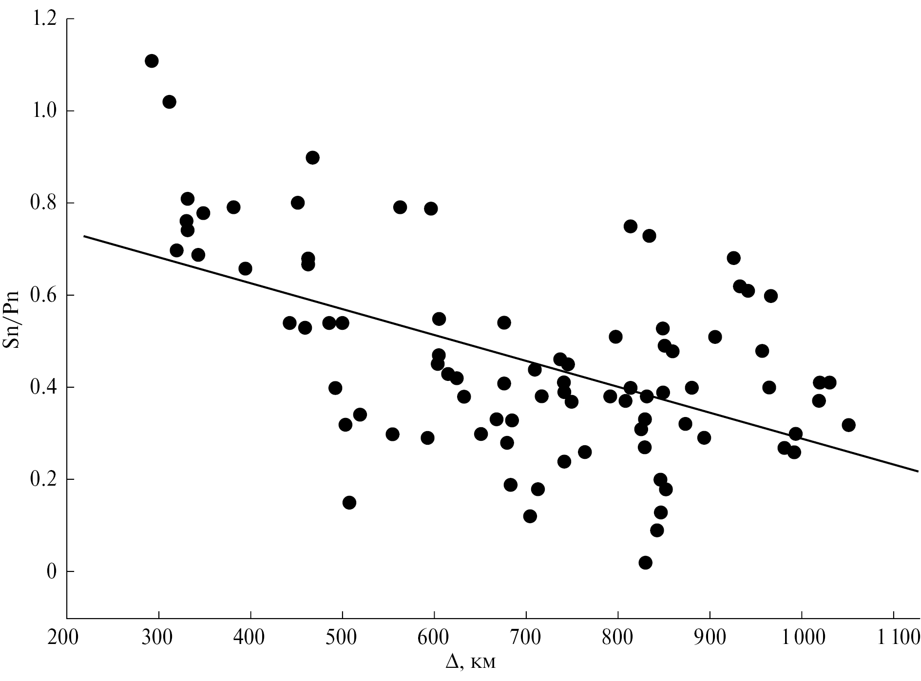 Южный район. Рис. 3 иллюстрирует зависимость параметра Sn/Pn от расстояния для трасс к югу от ст. PET, пересекающих Центральные, Северные Курилы и Южную Камчатку. Подавляющее большинство точек представляют средние значения, полученные для небольших областей с линейными размерами, как правило, несколько десятков км. Осреднение данных позволяет уменьшить роль эффекта азимутальной направленности излучения Р- и S-волн. Из рисунка следует, что в среднем значения Sn/Pn падают с расстоянием в интервале Δ ~ 300–1050 км; уравнение линейной регрессии описывается выражением: