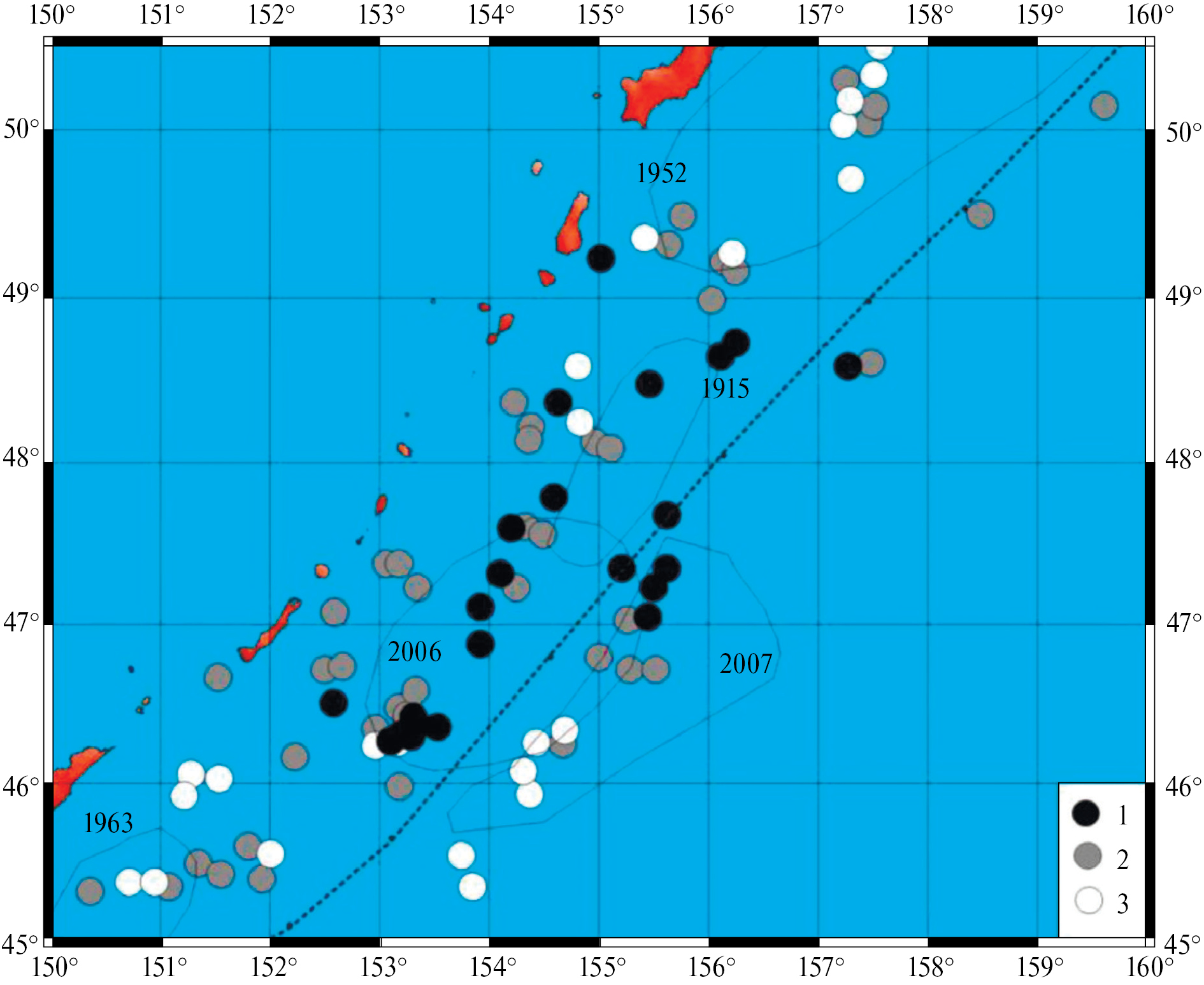 Таблица 1. Сильные землетрясения в районе Курило-Камчатской дуги (к северу от 44˚ N, с начала ХХ-го века)