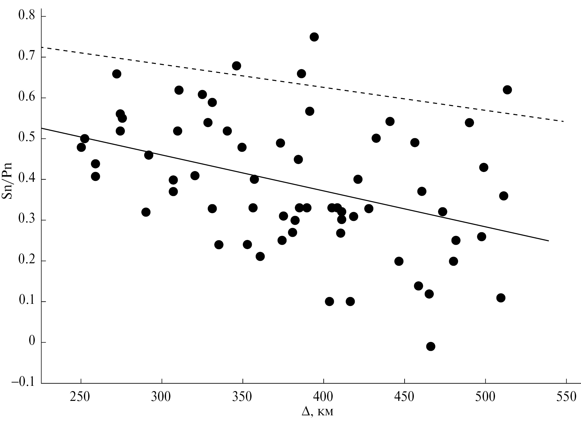 Sn/Pn ~ 0.84 – 0.00054Δ (км), (1)