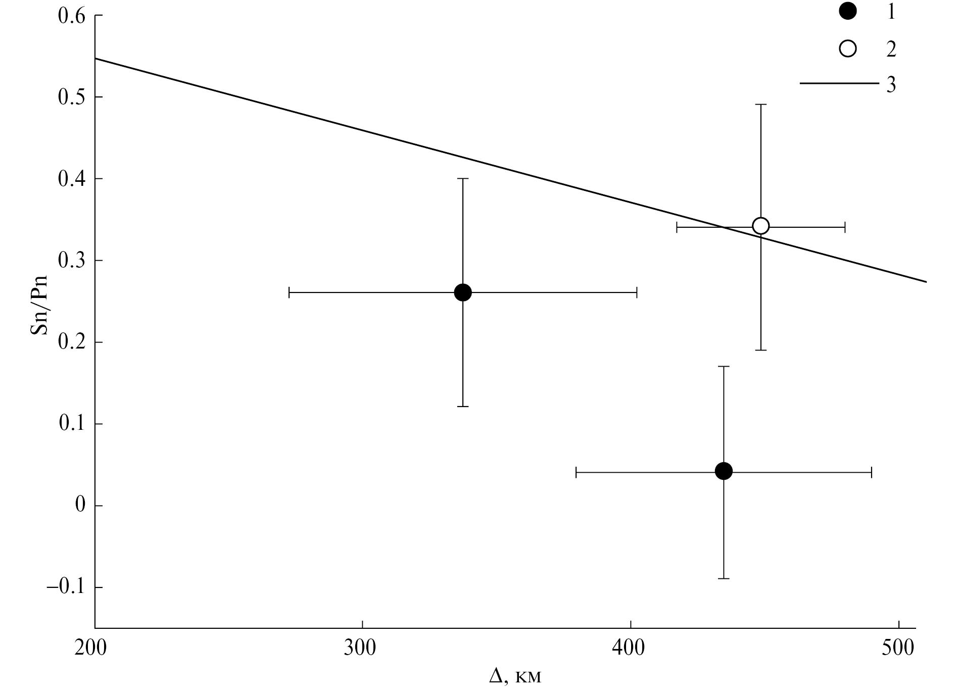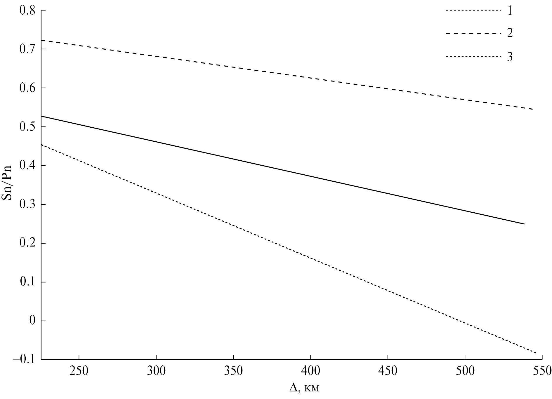 Следует заметить, что на фоне общего падения с расстоянием выделяются участки очень высоких средних значений параметра Sn/Pn (в интервалах Δ ~ 300–450 и 850–1050 км), а также аномально низких значений (при Δ ~ 450–850 км).