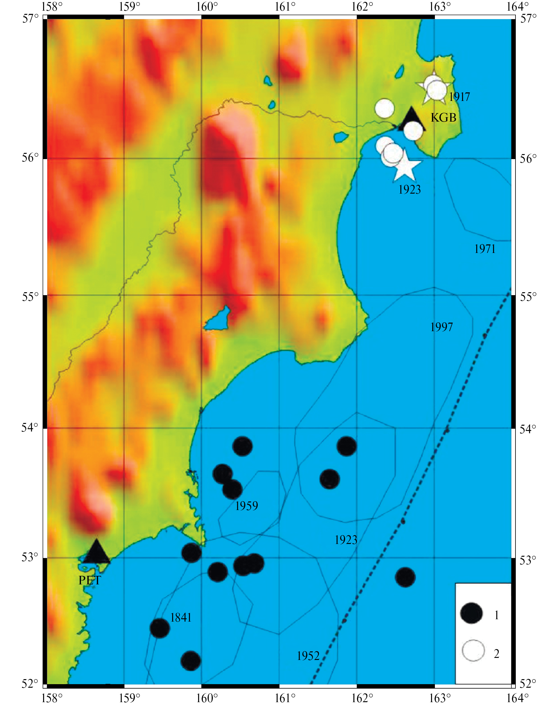 Рис. 7. Эпицентры землетрясений, зарегистрированные станцией KGB (1), эпицентры событий вблизи от станции KGB, зарегистрированные станцией PET (2). Остальные условные обозначения см. рис. 1.