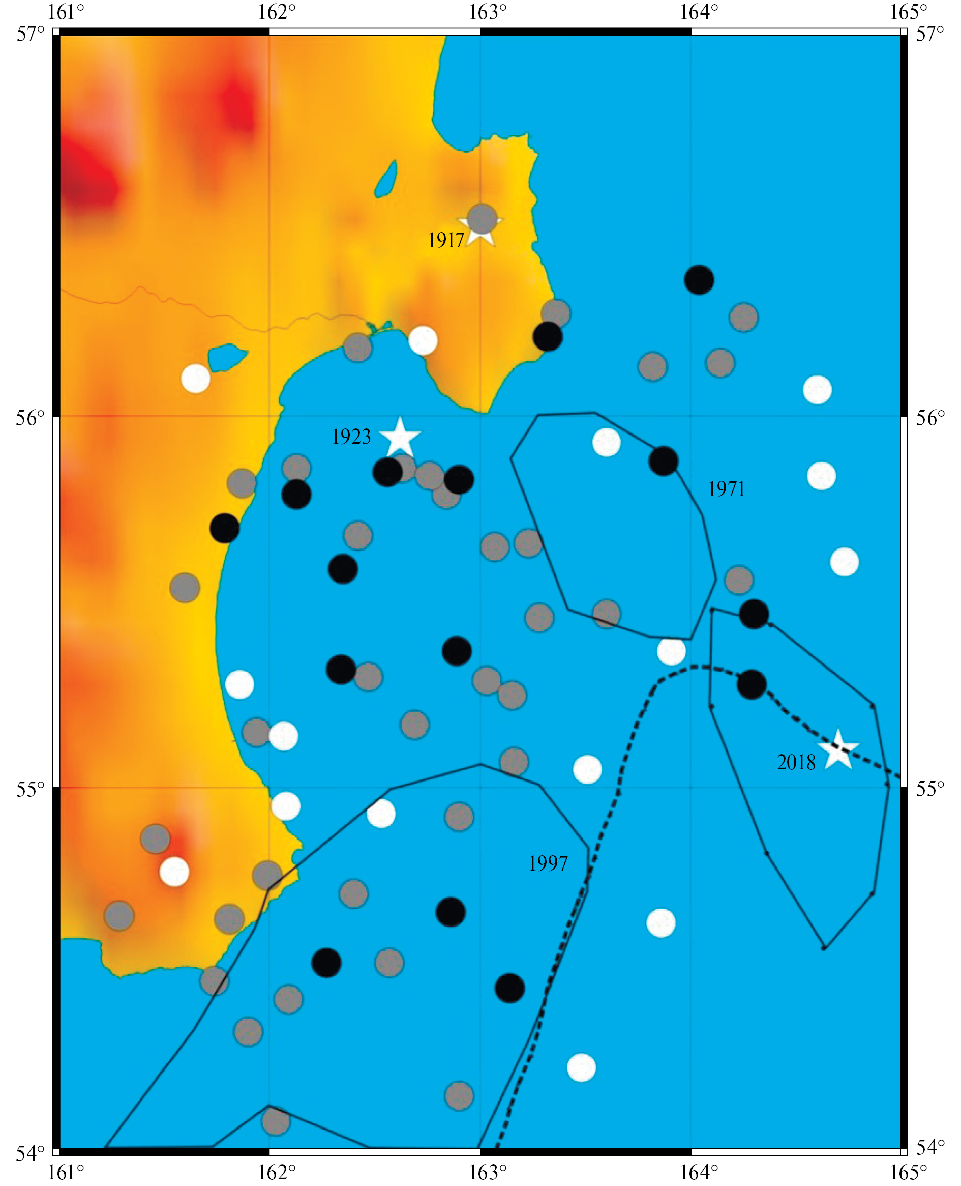 Великое Камчатское землетрясение 4 ноября 1952 г. было третьим по силе сейсмическим событием ХХ-го века с очагом, имевшим размер ~600 км. Землетрясение генерировало цунами, распространившееся по всему Тихому океану. По данным работы [Федотов и др., 2007], средний период повторяемости событий с М ≥7.7 в районе Курило-Камчатской дуги составляет 140 ± 60 лет. В течение последних 60 лет в районах Северных Курил и Камчатки не зарегистрировано неглубоких событий с Mw >7.8, в то время как в районах Южных и Центральных Курил в 1963‒2007 гг. произошло 5 землетрясений с Mw >8.0.