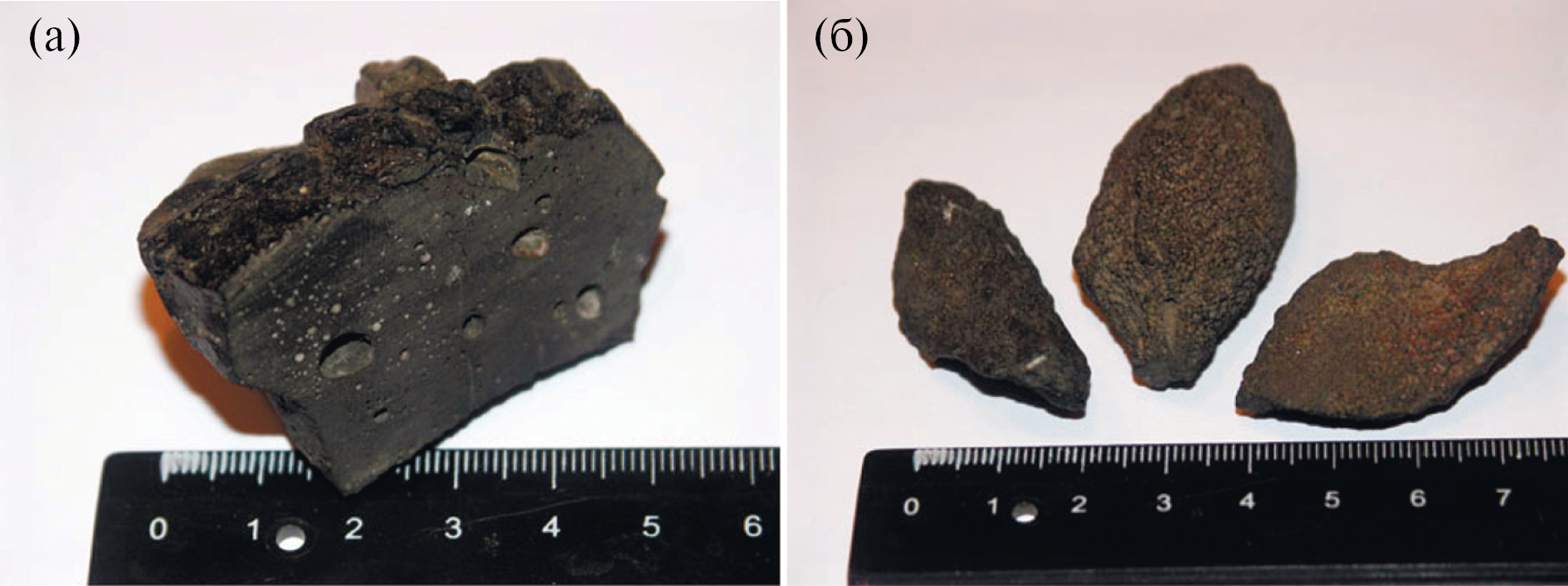 Рис. 3. Образец афирового миндалекаменного базальта (а) и мини-бомбы (б).