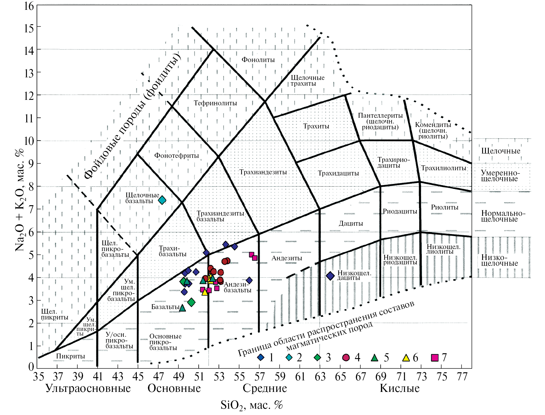 - Irvine T.N., Baragar W.R.A. A guide to the chemical classification of the common volcanic rocks // Canadian Journal of Earth Sciences. 1971. V. 8. № 2. P. 523–548. https://doi.org/10.1139/e71-055