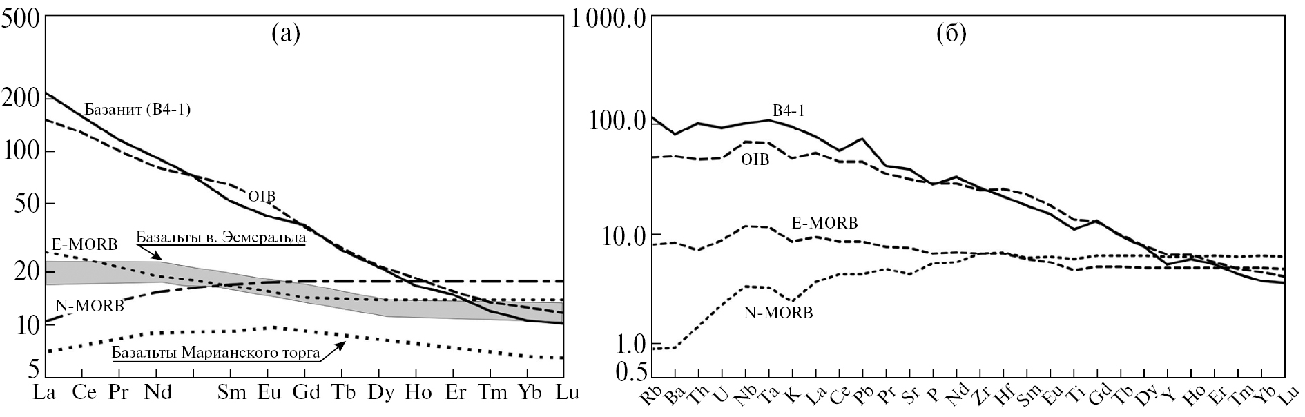 Рис. 10. Нормализованные по хондориту [Sun, McDonough, 1989] данные по РЗЭ базальтов вулкана Эсмеральда, Марианскому трогу [Stern, Bibee, 1984] и базаниту B4-1 (а) и нормализованные по примитивной мантии [Sun, McDonough, 1989] редкие и редкоземельные элементы в базаните B4-1 (б).