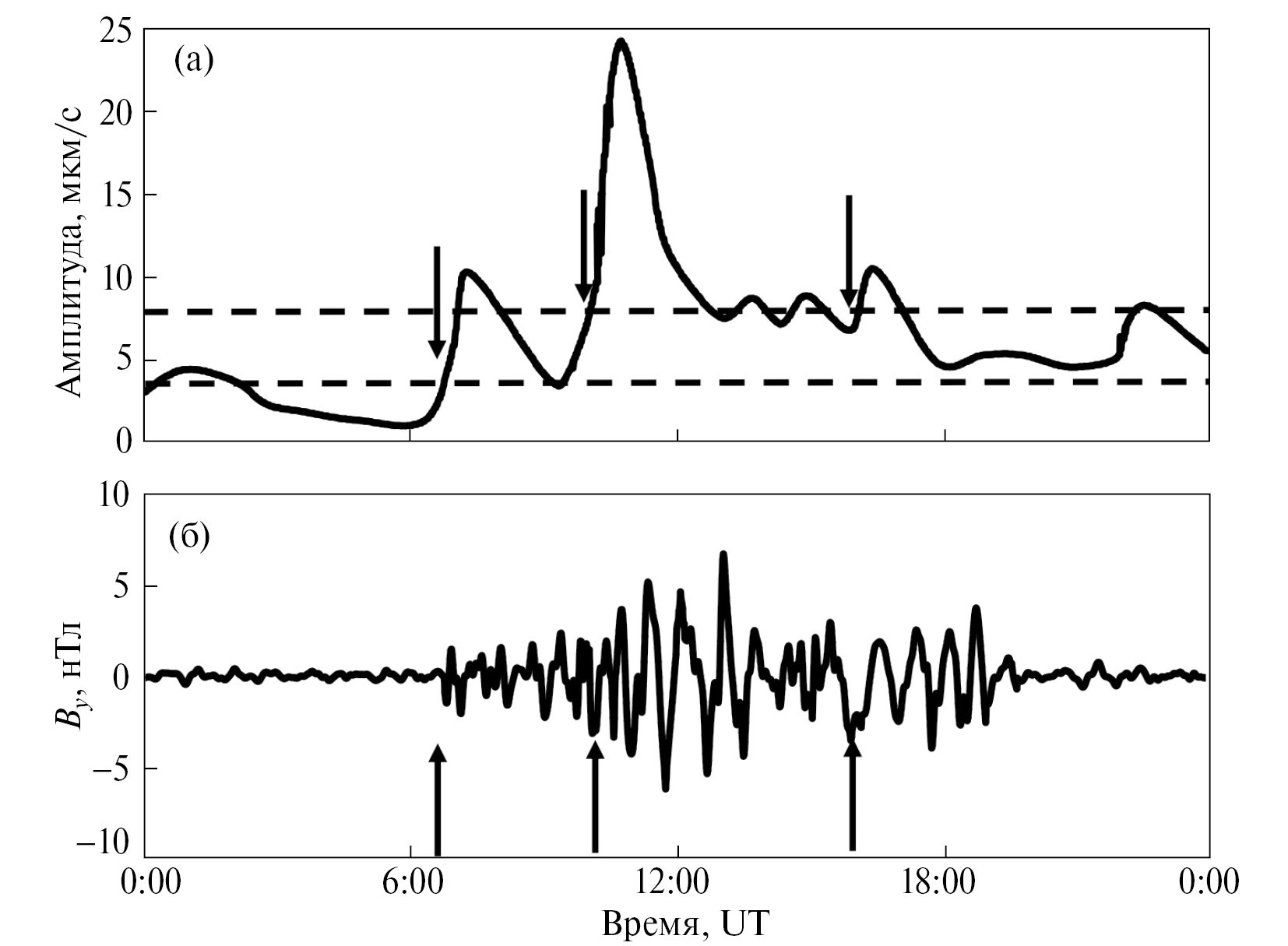 Если использовать оценочную формулу для основного периода ВГВ Т = ТВ (L/h), где TB ‒ период, соответствующий частоте Брента-Вяйсяля, L ‒ расстояние от источника до пункта регистрации сигнала, h ‒ высота в ионосфере, то ожидаемый период вариаций на станции “Гальяно” (около 8 мин) отличается от зарегистрированного (15‒25 мин). Отметим однако, что данная оценочная формула не учитывает влияние ветра на распространение ВГВ. При наличии ветра возникает доплеровский сдвиг, который может снижать частоту волны [Fritts, VanZandt, 1987]. Этот же эффект может влиять и на снижение частот сигналов, регистрируемых в F-слое ионосферы в соответствии с наблюдениями.