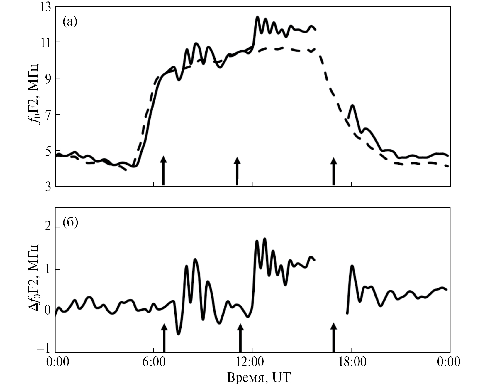 Рис. 6. Суточный ход критической частоты F2-слоя (f0F2) за 09.10.2022 г. на станции мониторинга ионосферы “Гибильманна” – сплошные линии; медианные месячные значения f0F2 за октябрь того же года – пунктирные кривые (а); суточный ход разницы ∆f0F2 между значениями f0F2 за 09.10.2022 г. и медианными значениями за октябрь 2022 г. (б); стрелками обозначены начала высоких значений вулканического дрожания.