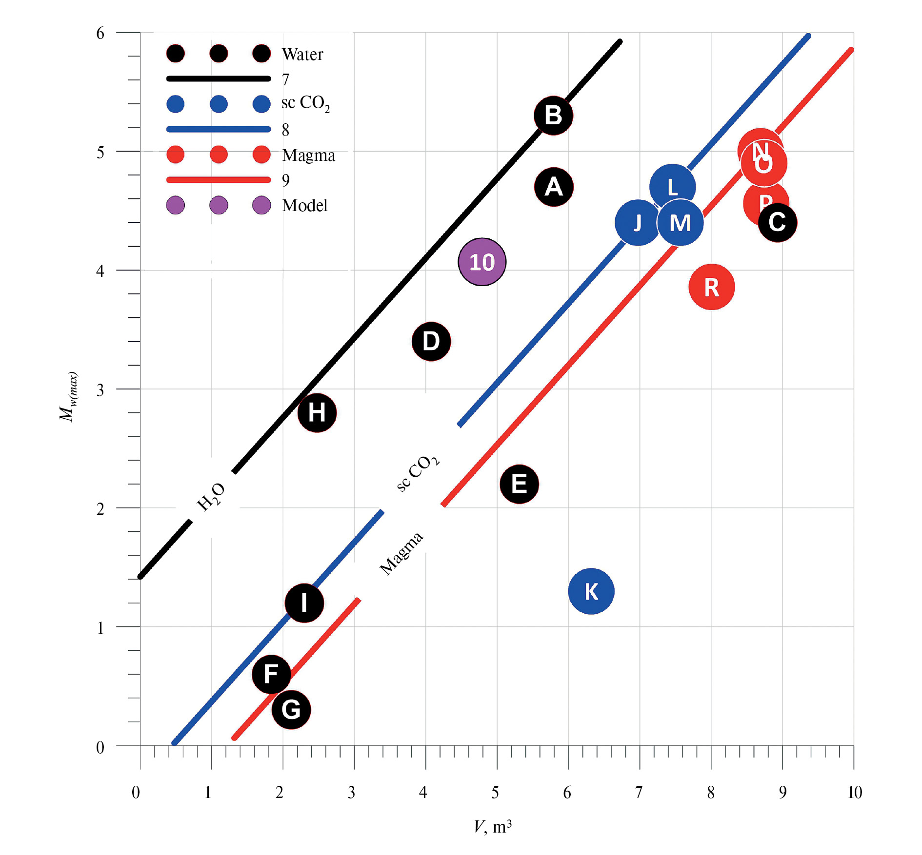 Рис. 1. Теоретические зависимости и экспериментальные данные, связывающие объем закачиваемого флюида V (м3) и максимальную магнитуду Mw(max) триггерного сейсмического события. Легенда: A-I – экспериментальные данные по инжекции воды (см. табл. 1); 7 – теоретическая зависимость для воды, уравнение (7); J-K – экспериментальные данные по инжекции scCO2 (см. табл. 1); 8 – теоретическая зависимость для scCO2, уравнение (8); N-R ‒ данные по объемам извержений вулканов (см. табл. 1); 9 ‒ теоретическая зависимость для магмы, уравнение (9); Model – результаты CFRAC-моделирования инжекции магмы в сдвиговую трещину в основании Мутновского вулкана [Kiryukhin et al., 2022, вариант #10, Table 3].