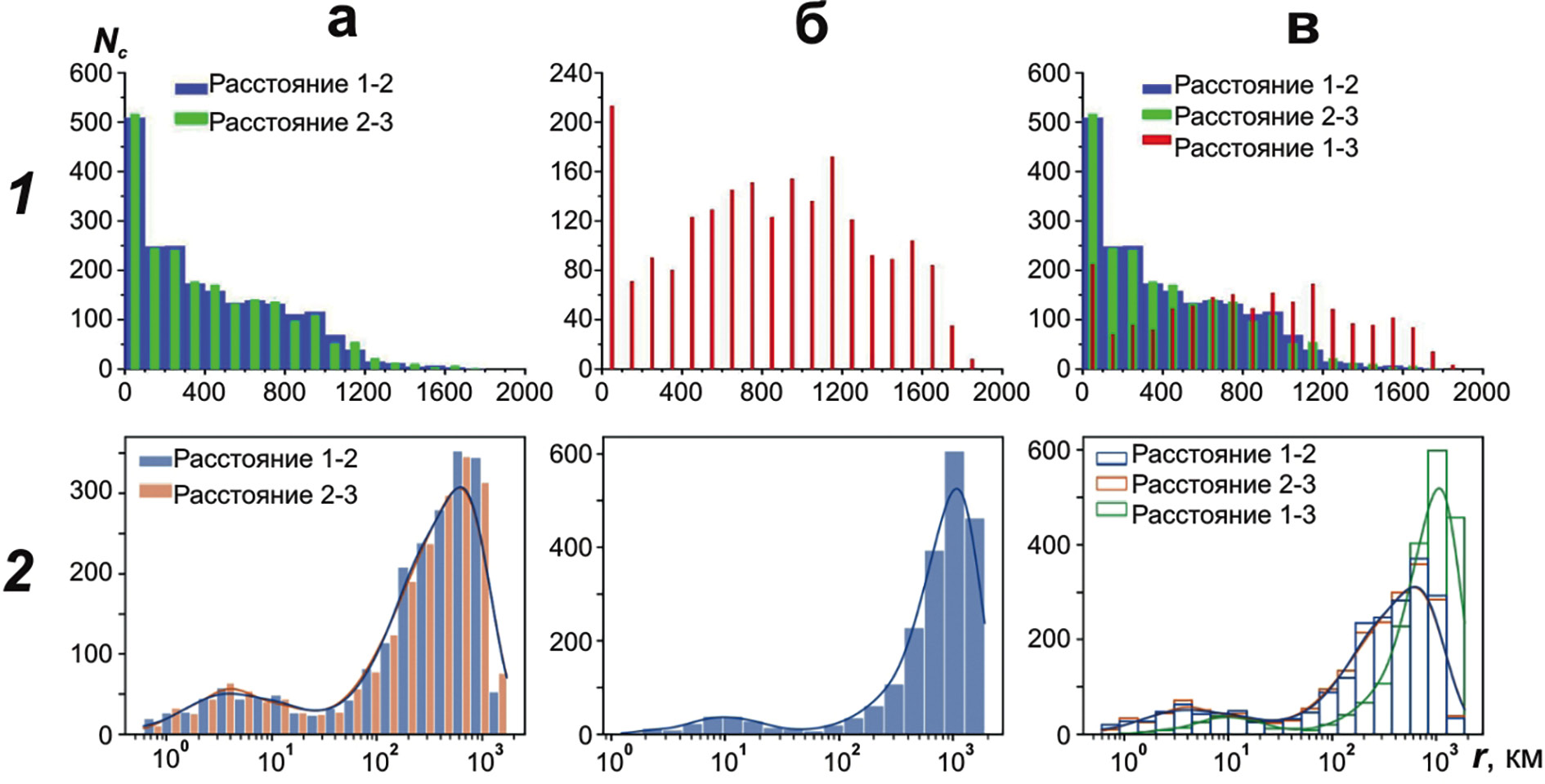 Рис. 2. Гистограммы распределения количества цепочек землетрясений c KР ≥ 8, выделенных в Байкальском регионе, по расстояниям r и их осредняющие кривые в линейном (1) и логарифмическом масштабах (2). а – для расстояния от первого до второго землетрясения (Расстояния 1-2) и от второго до третьего (Расстояния 2-3), б – от первого до третьего толчка цепочки (1-3), в – обобщенная гистограмма.