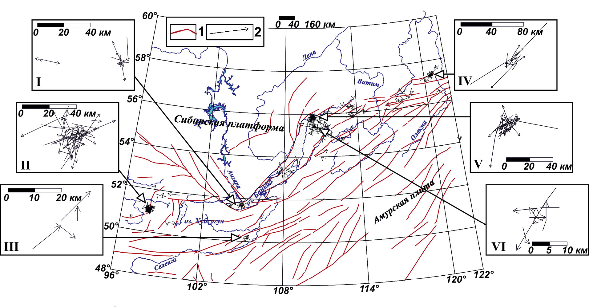 Рис. 3. Карта расположения и ориентации цепочек группирующейся сейсмичности в областях групп сейсмических событий в земной коре БРС. 1 – разломы, 2 – цепочки группирующейся сейсмичности. На врезках – эпицентральные области Южнобайкальского (1999 г.) и Култукского (2008 г.) землетрясений (I), Бусийнгольских землетрясений 1976 г. и 1991 г. (II), Кяхтинского землетрясения 1989 г. (III), Олдонгсинской группы землетрясений 1997 г. (IV), Кичерского землетрясения 1999 г. (V), Томпудинской серии толчков 2007 г. (VI).