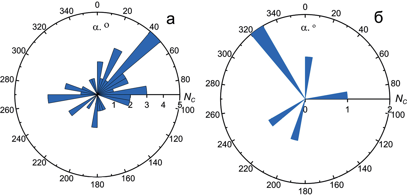 Рис. 5. Розы-диаграммы распределения количеств цепочек группирующейся сейсмичности NC по азимуту α в области Южнобайкальского землетрясения. а – для всех выделенных цепочек; б – распределение ориентаций нодальных плоскостей в очагах землетрясений группы [Radziminovitch et al., 2005].