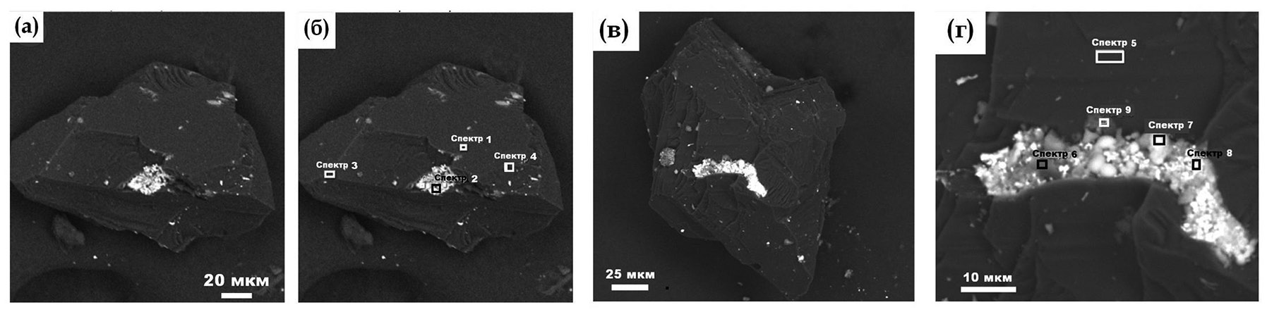 Рис. 4. Толбачинские алмазы с примазками вулканогенных микроминералов на поверхности (светлое) (а, в) и участки рентгеноспектрального микрозондирования (б, г). СЭМ-изображения в режиме упруго-отраженных электронов.