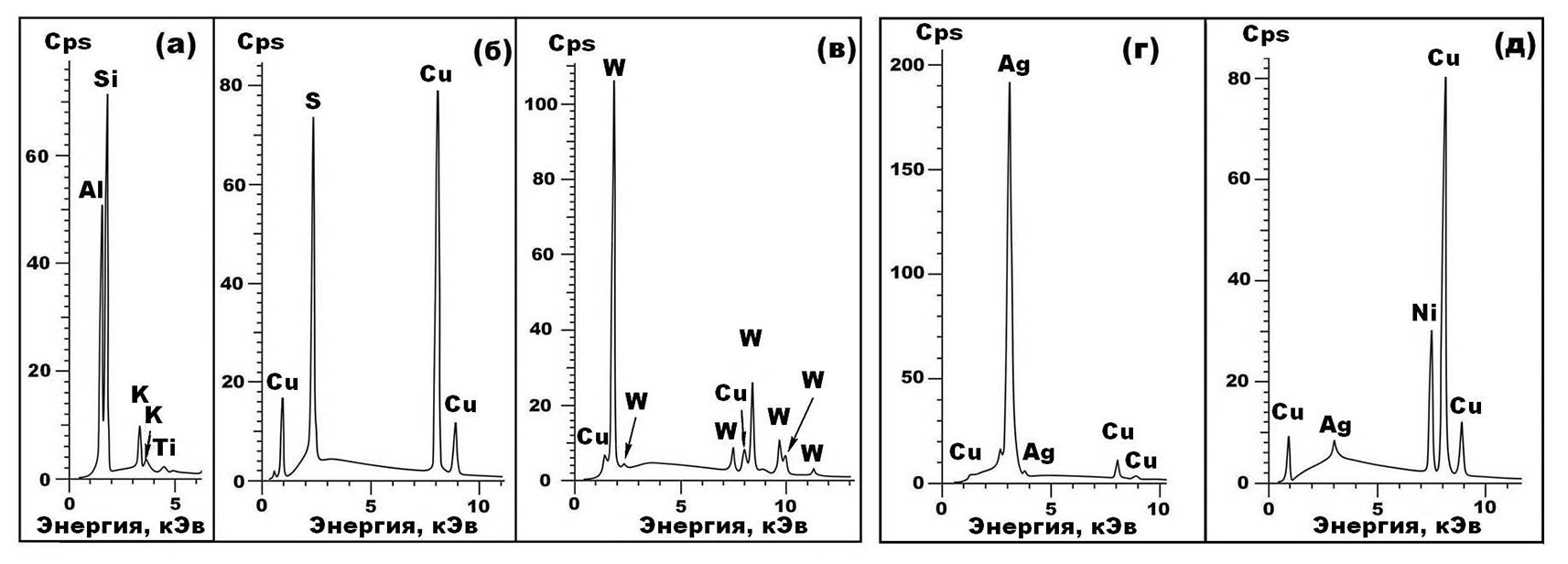 Кроме этих минералов в составе туфобрекчий методом рентгеноспектрального микрозондового анализа установлены медно-халькозиновые твердые растворы состава (0.95–0.98)Cu2S + (0.02–0.05)Cu (см. рис. 7б); вольфраматы состава (Cu0.55–0.66Ni0.23–0.45Ag0–0.11)[WO4]; поликомпонентные металлические сплавы: медно- вольфрамовые – W0.98–1Cu0–0.02, вольфрам-медно- серебряные – Ag0.83–0.9W0–0.11Cu0–0.14, вольфрам- никель-медные – Cu0.72–0.78Ni0.22–0.27Ag0–0.02W0–0.01 (см. рис. 7в, 7г, 7д).
