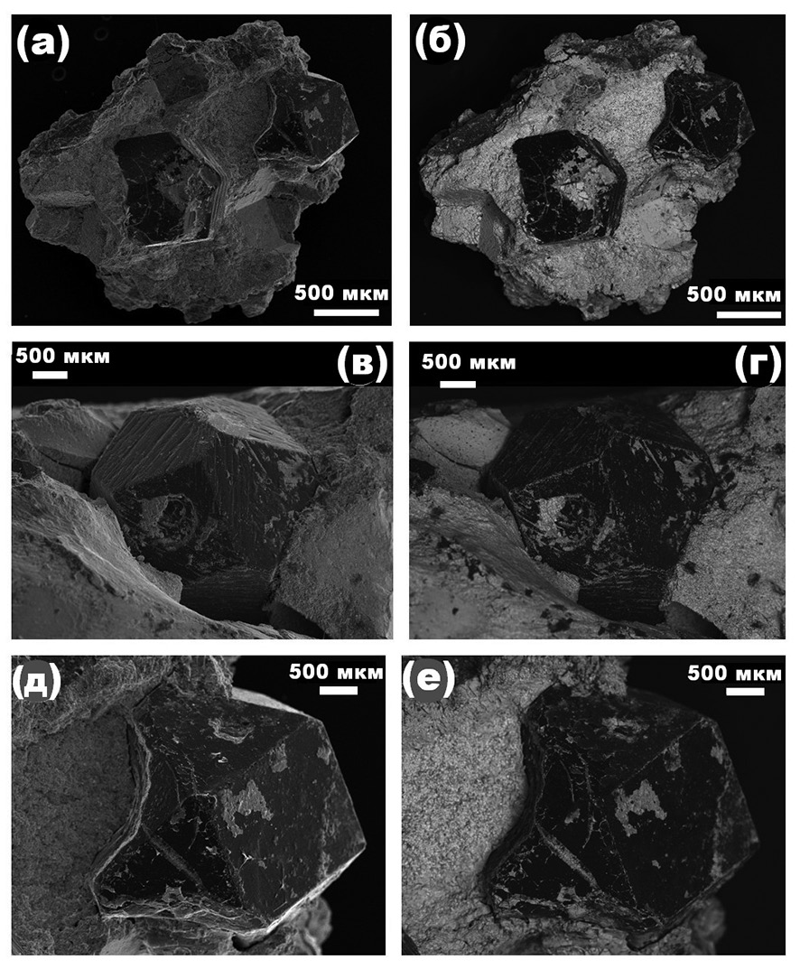 На поверхности кристаллов имеются микропленки и примазки (рис. 4), сложенные фазами и минералами эксплозивного происхождения, безусловно доказывающими вулканогенное происхождение толбачинских алмазов [Силаев и др., 2015а, 2015б; Карпов и др., 2017; Галимов и др., 2020; Силаев и др., 2023а]: стеклофаза андезибазальт-андезитового состава; оливин (Mg1.82–1.86Fe0.14–0.18)2[SiO4]; халькокианит (Cu0.86–1 Zn0–0.02Ca0–0.09Fe0–0.01K0–0.01)[SO4]; тенорит CuO; бунзенит (Ni0.83–0.88Cu0–0.13Mn0.04–0.11Fe0–0.04)O; никелевый купорос Ni[SO4]; Fe-Cu-Ni манганит (Mn0.52Ni0.23Cu0.16Fe0.13)O; паратакамит (Cu1.92–1.95Zn0.05–0.08)2Cl1.02–1.24Br0–0.05[SO4]0.03–0.13 (OH)1.78–2.84; виллиманинит CuS2; силициды состава (Mn,Ni)4Si–(Mn,Ni)5Si2 и Mn4Si–Mn5Si2; самородный алюминий и ассоциация металлических сплавов Fe-Ni-Cu-W-Al. Внутри кристаллов выявлены субмикронные включения карбидов Fe, W, Si.